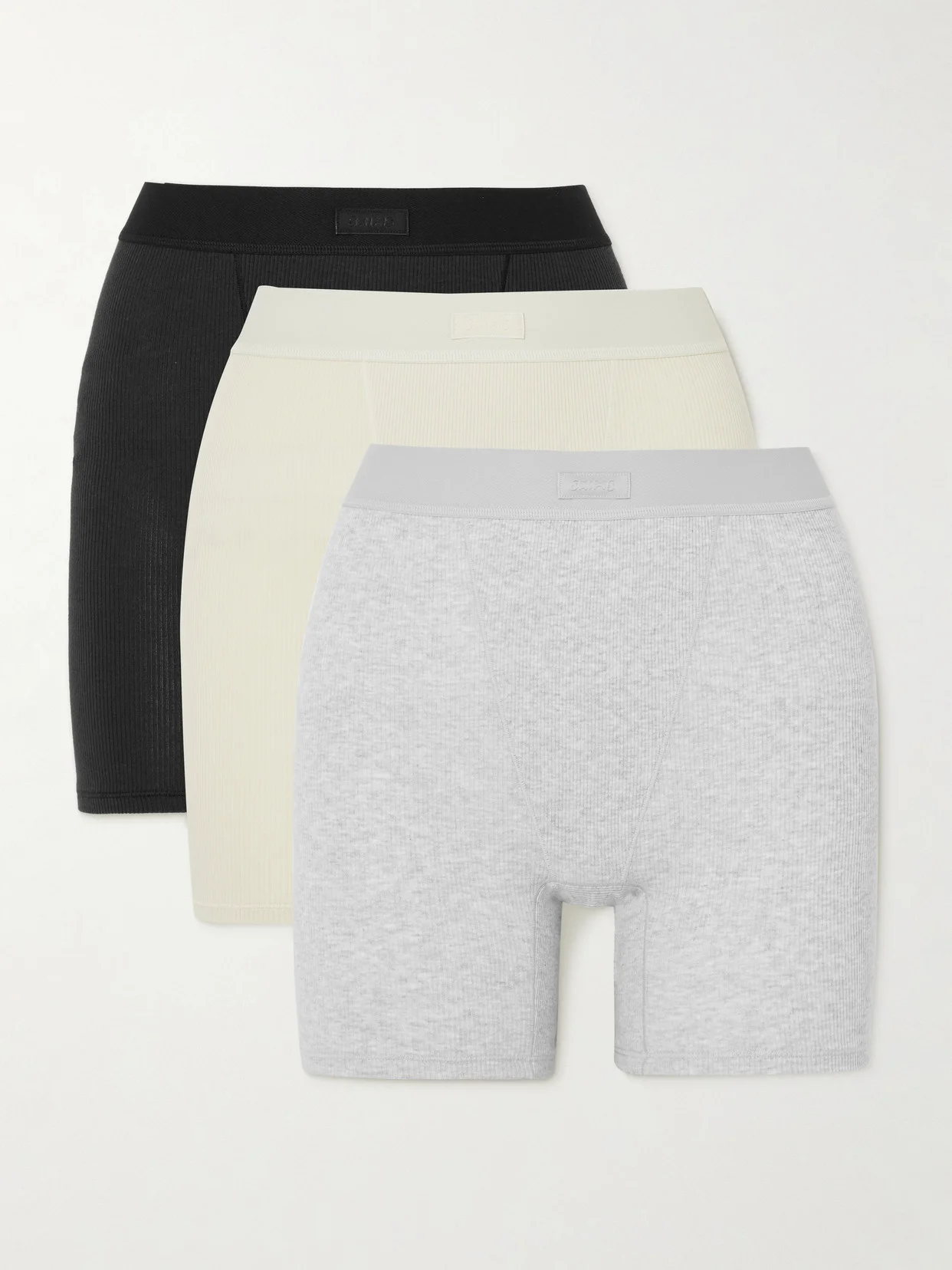 SKIMS' shorts are inspired by the shape and comfort of men's boxers. In a set of three, they're made from ribbed cotton-blend jersey and have an elasticated waistband appliqued with the label's logo patch. Wear yours with a tonal tank while lounging at home.