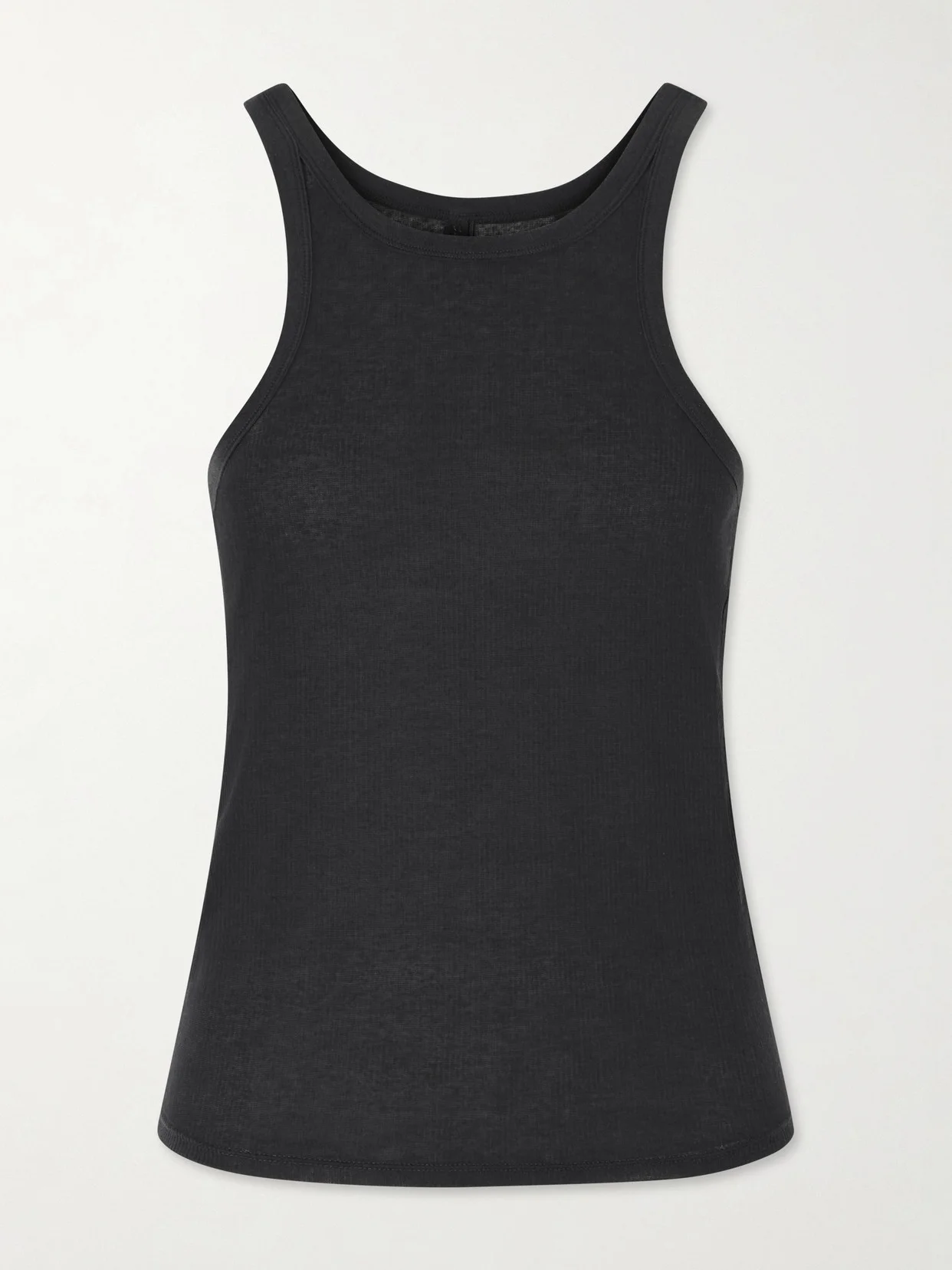 Skims redefines wardrobe essentials with comfort, fit, and modern versatility in this tank top. Made from sheer ribbed jersey, it has a slim fit with a classic crewneck and cutaway sleeves, making it a perfect foundational piece for layering or styling on its own.