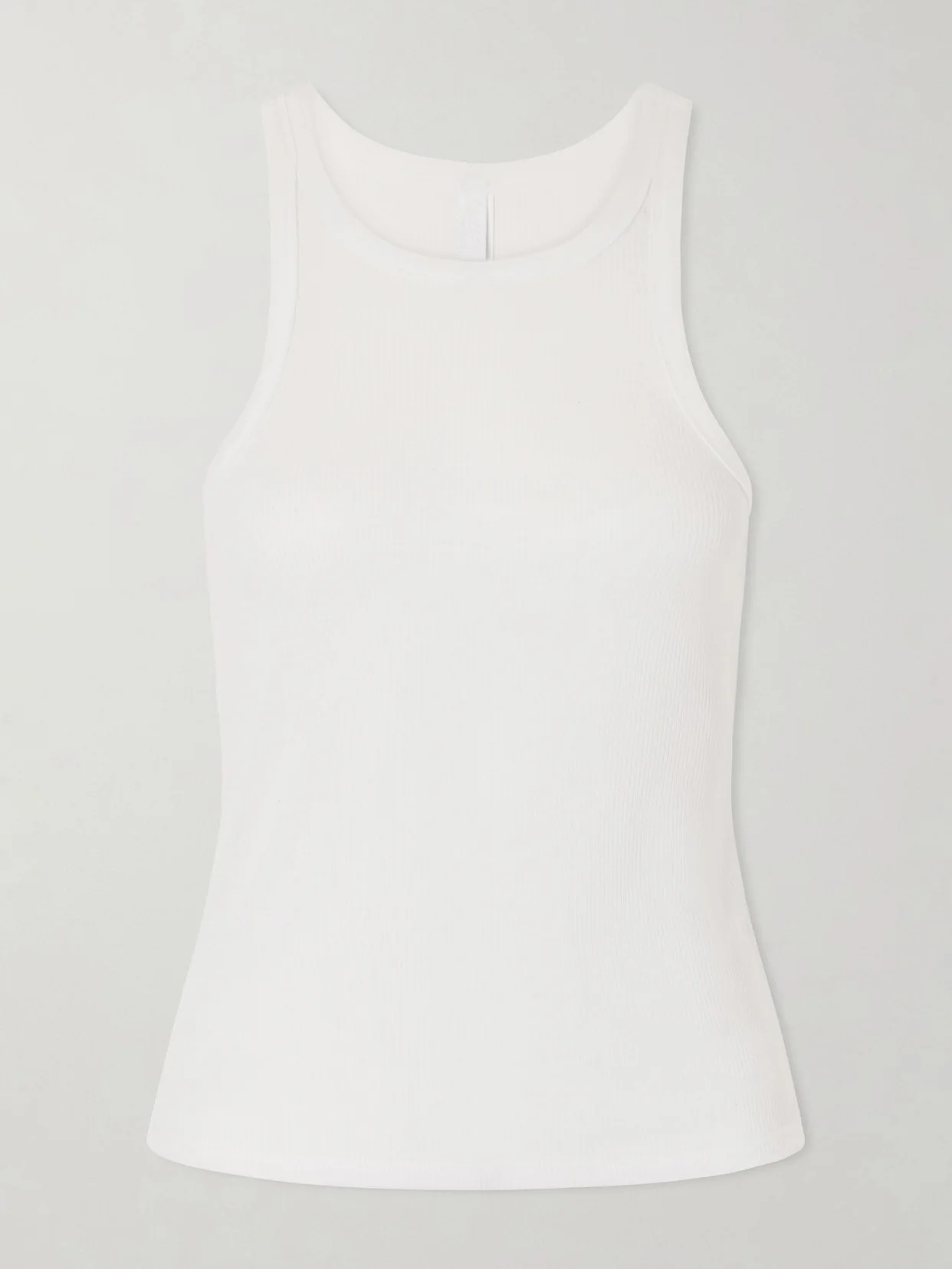 Skims redefines wardrobe essentials with comfort, fit, and modern versatility in this tank top. Made from sheer ribbed jersey, it has a slim fit with a classic crewneck and cutaway sleeves, making it a perfect foundational piece for layering or styling on its own.