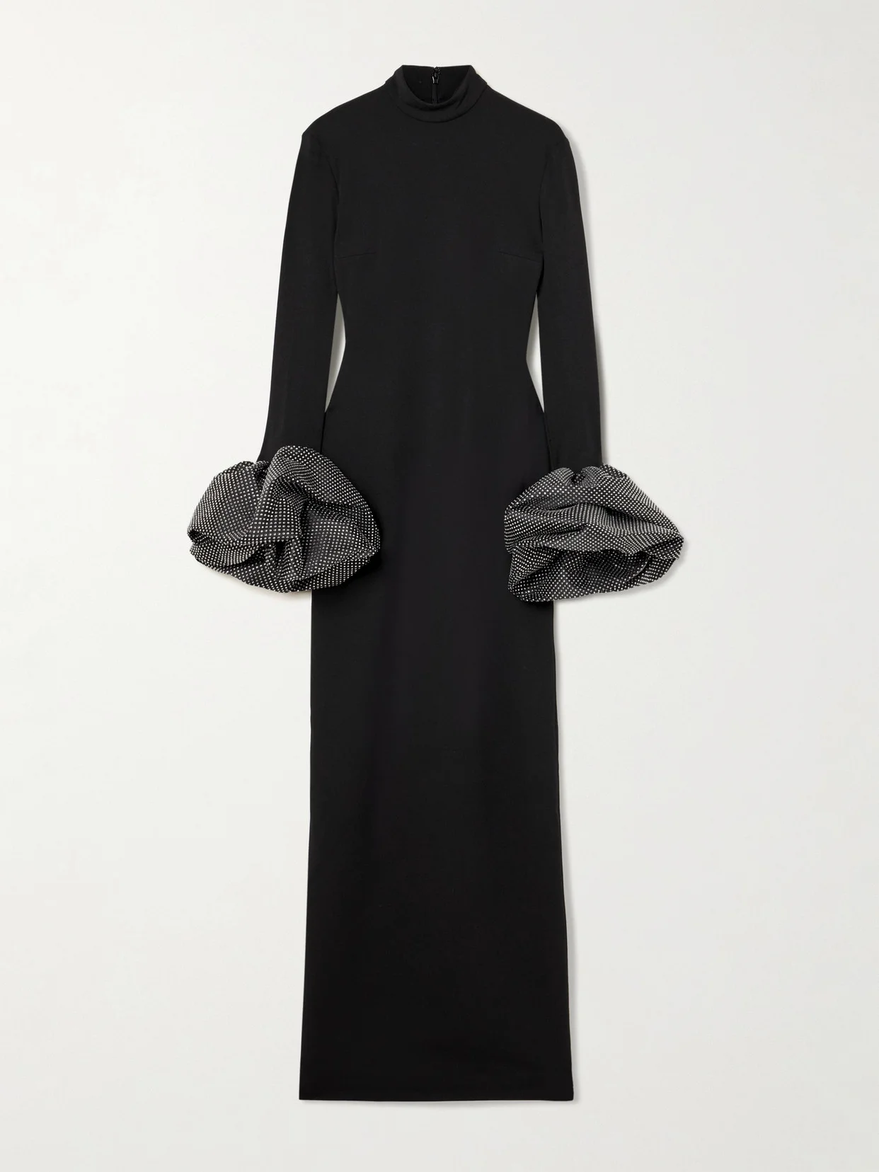 Solace London's 'Viviana' gown captures the London brand's graphic yet elegant aesthetic. It's cut from sculpting cady in a refined, figure-skimming shape with a chic turtleneck and voluminous cuffs covered in crystals. Lift the maxi hem with tonal heels.