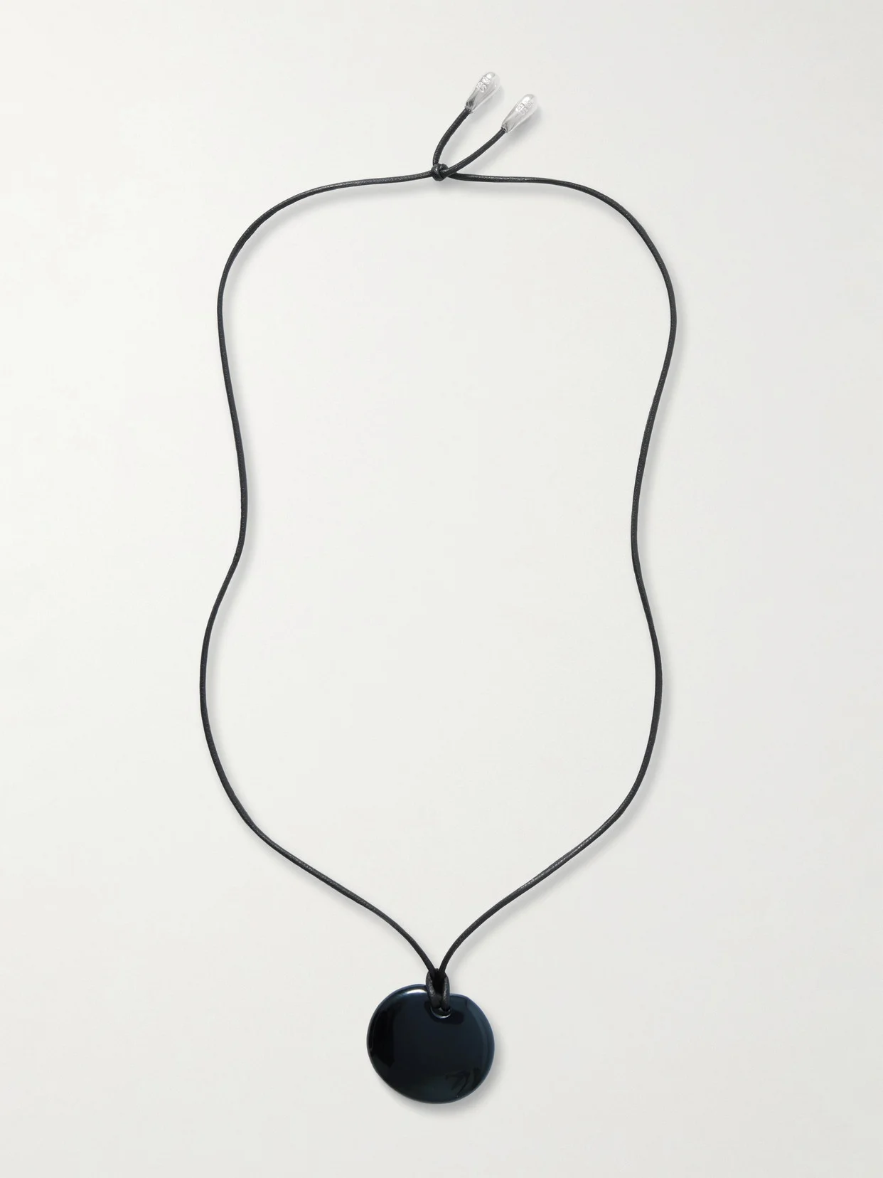 Sophie Buhai's necklace is strung with an onyx stone - the large rounded shape represents the 'Full Moon', a symbol of feminine power. It's handcrafted in Los Angeles with an adjustable vegan leather cord tipped with silver droplets at each end.