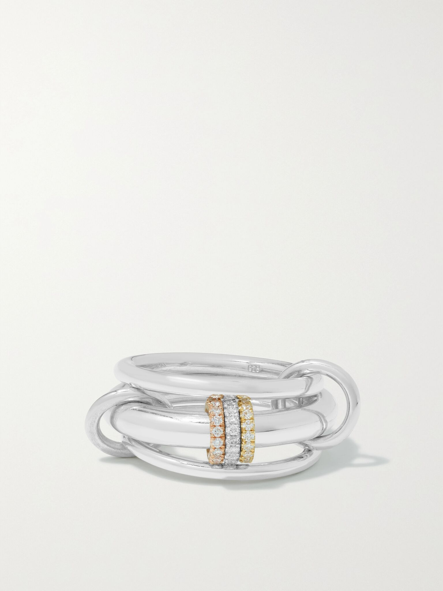 Spinelli Kilcollin's 'Gemini' ring set features the label's signature design of interlinked bands. Handmade from 18-karat white gold, it's dotted with glistening diamonds in rose and yellow gold settings. Wear yours across three fingers or stacked on one. Size & Fit - US sizing Measurements can be found in the link below Details & Care - Round brilliant-cut G VS diamonds, total weight: 0.27-carats - This piece is handmade and as such may have some small flecks or scratches