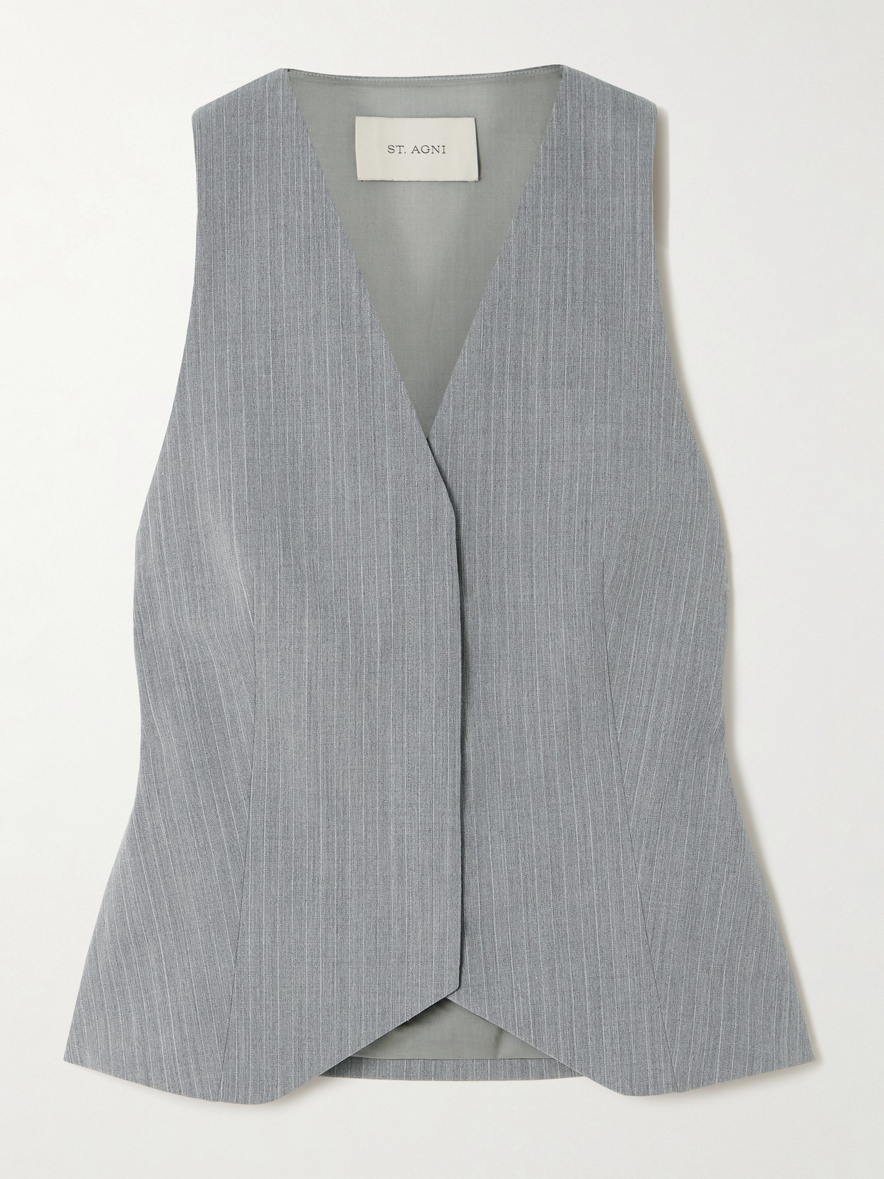 ST. AGNI's 'less is more' approach to design results in timeless staples you can depend on. Tailored from wool-blend twill, this vest is patterned with subtle pinstripes and finished with a notched hem. Wear yours with the coordinating shorts and mules. Lower-Impact Materials. This product is made using at least 50% lower-impact materials or ingredients. Find out more about our NET SUSTAIN criteria here.