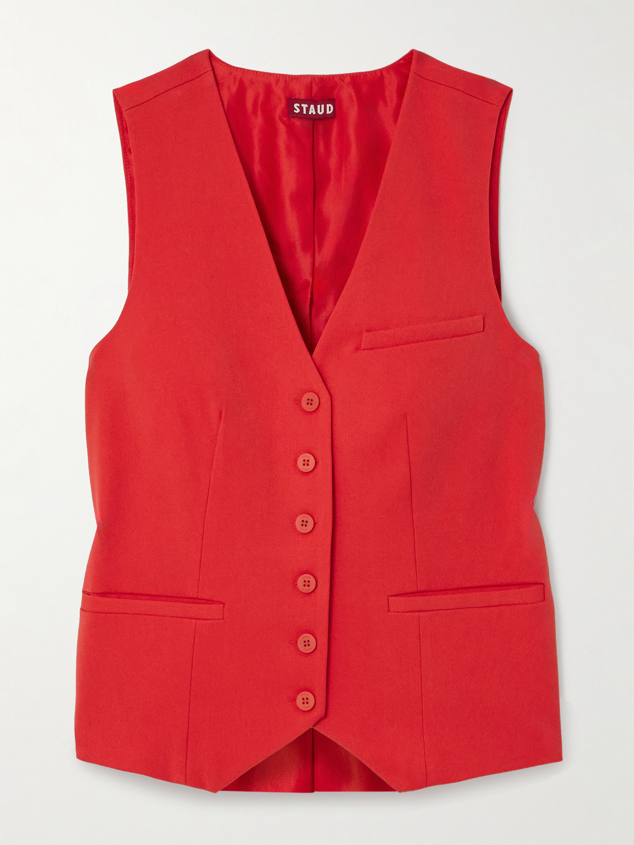'Tomato' red is a key color for Spring '24 and STAUD's latest collection is packed full of the vibrant shade. This 'Brett' vest is tailored from twill for a slim fit and traced with tonal buttons. Take notes from the runway show and style yours as part of a suit.