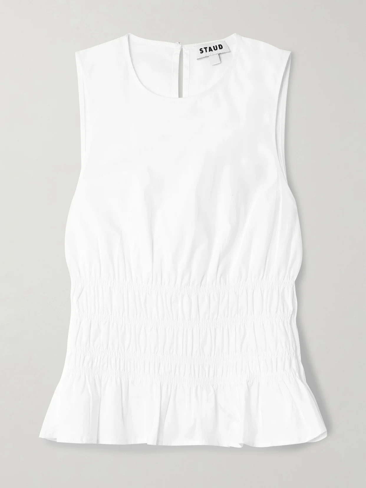 STAUD's 'Culver' top is a fresh take on everyday dressing. Made from cotton-blend poplin, it has a sleeveless shirred silhouette and a ruffled peplum hem that adds gentle movement and dimension. Wear yours with flared denim or a high-rise skirt.