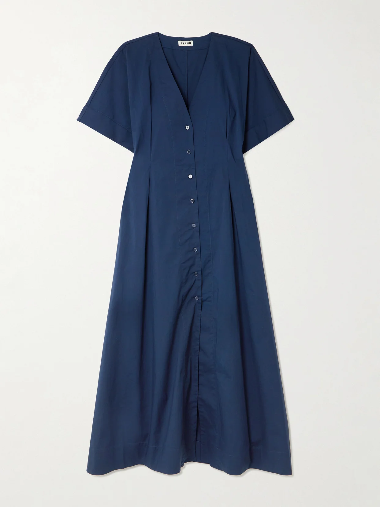 STAUD's 'Elle' midi dress showcases a cool approach to everyday elegance. Made from cotton-blend, it has a fitted bodice balanced by floaty sleeves and a full skirt. Highlight the plunging neckline with jaw-grazing earrings.
