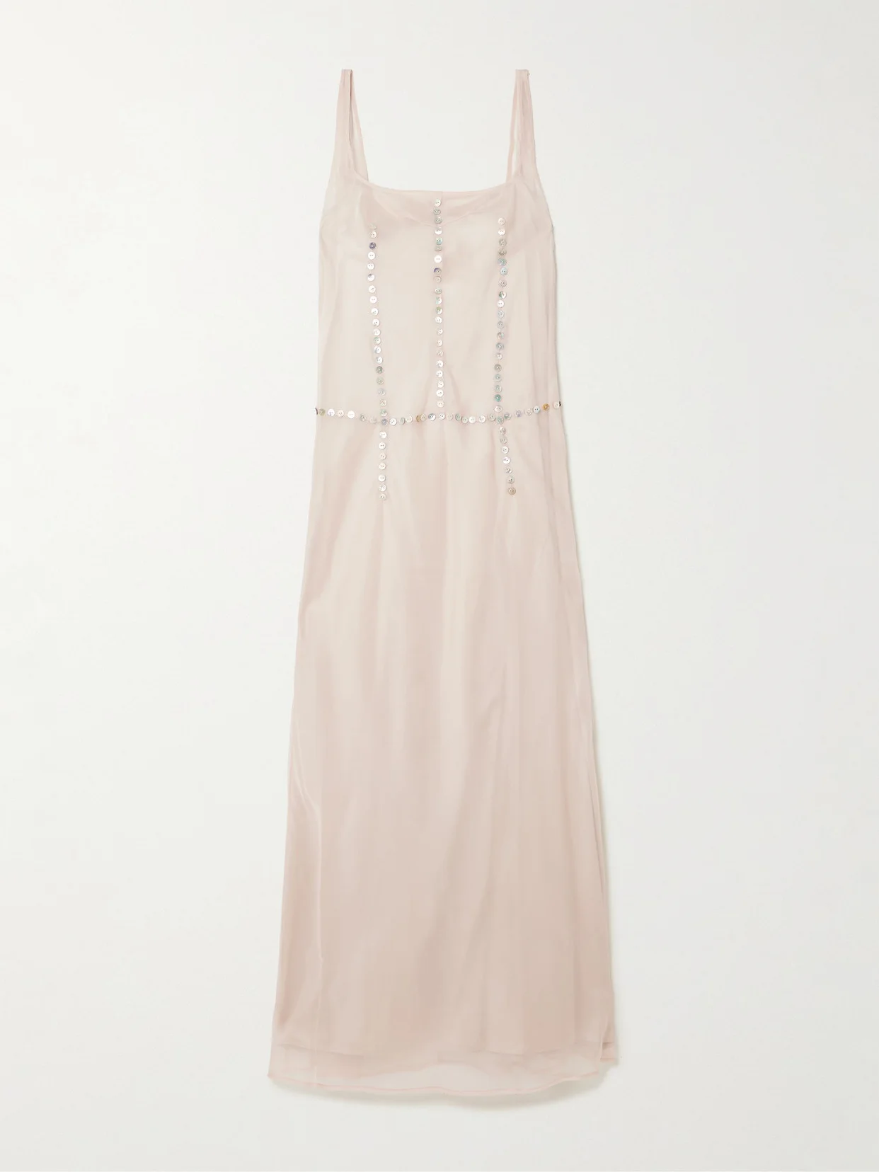 STAUD's 'Greta' dress has a whimsical feel. It's cut from airy silk-organza enhanced by delicate mother-of-pearl buttons, while the low back and gently flared hem bring subtle movement. Match your accessories to the embellishment.