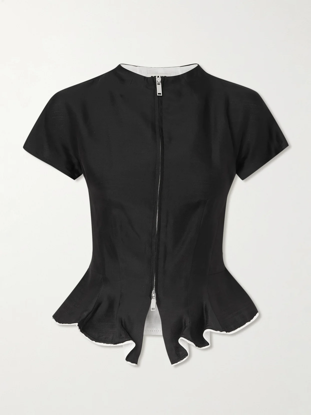 STAUD's 'Maelle' top is the perfect example of modern elegance. Knitted with a touch of wool, it has an hourglass silhouette that flares to a peplum with a frayed trim in contrasting white linen. The visible seams outline your frame, while the two-way zip transforms the fit.