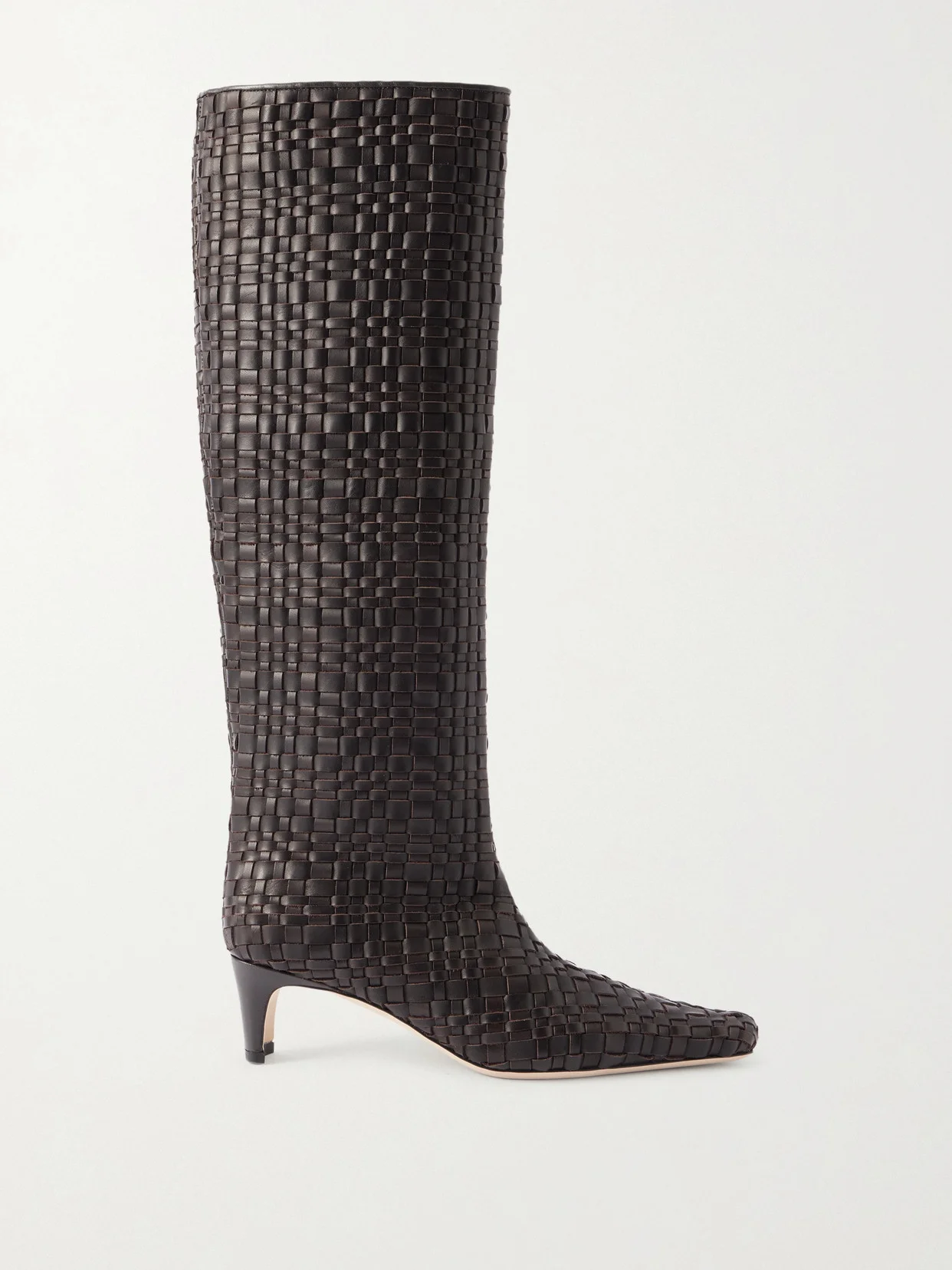 STAUD's 'Wally' knee boots are made from supple dark-brown leather and woven to give them a structured shape. They have pointed toes and slim 45mm heels.