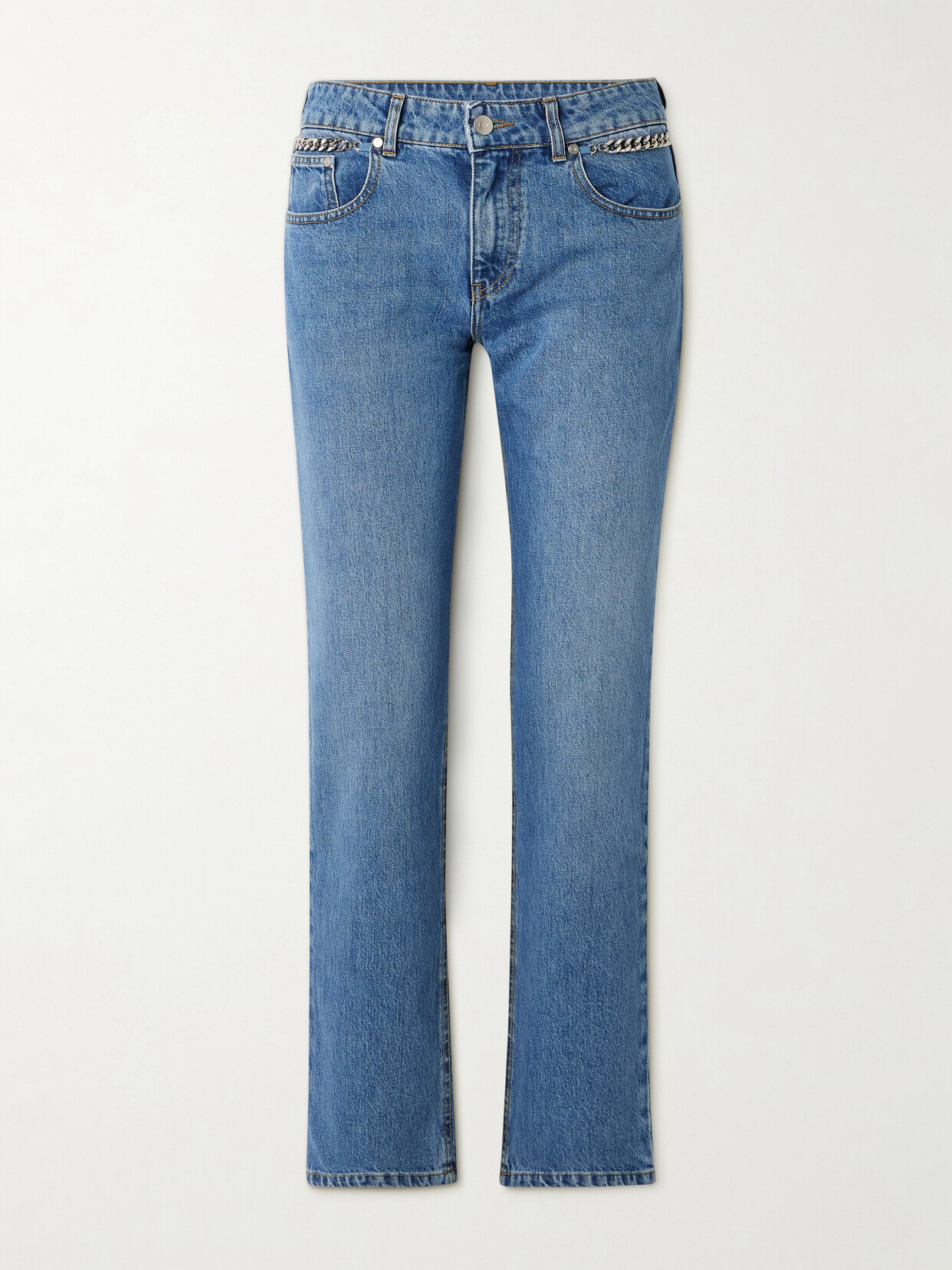 Stella McCartney's jeans are embellished with the same chain seen on the label's iconic 'Falabella' bags. They're cut from denim made with regenerative-certified cotton and whiskered for a love-worn look. The mid-rise, straight-leg shape is so classic. This product was created using Considered Materials. Find out more about NET SUSTAIN here.