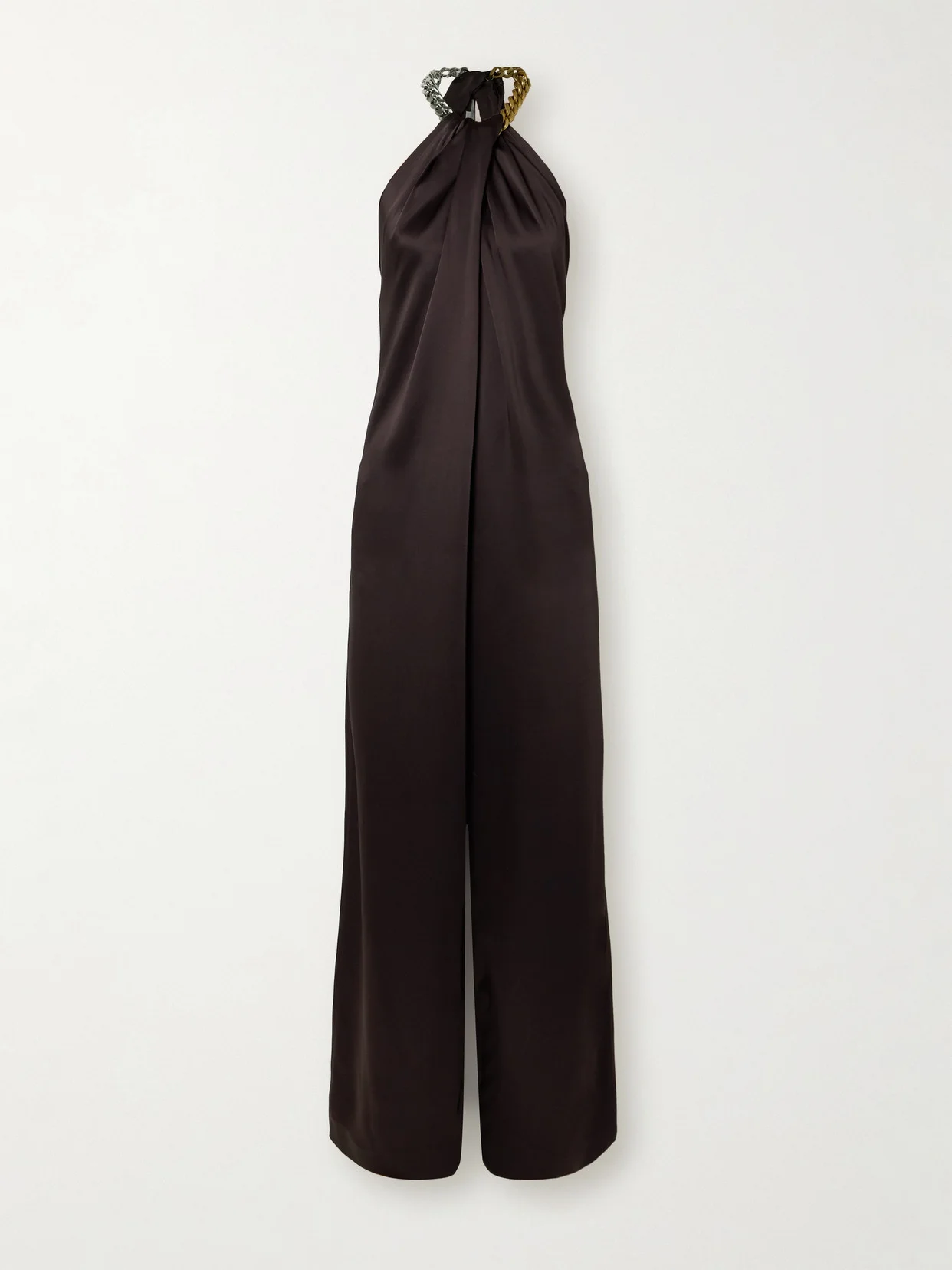 Stella McCartney's jumpsuit is defined by the bold chain halterneck - if you look closely you'll notice its designed in a dual silver and gold-tone. It's cut from lustrous satin in a rich chocolate shade and falls to straight legs. Style yours with strappy sandals and a metallic clutch.