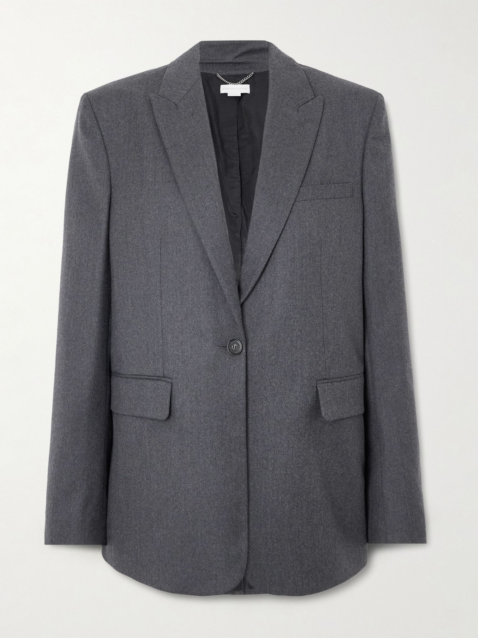 This relaxed blazer channels Stella McCartney’s "mastery of Savile Row tailoring". It's crafted from certified wool-twill, topped with padded shoulders and has a single-button fastening. Wear yours with a crisp shirt and slim pants. Lower-Impact Materials. This product is made using at least 50% lower-impact materials or ingredients. Find out more about our NET SUSTAIN criteria here. Size & Fit - Fits true to size, take your normal size - Intended for a slightly loose fit - Internal shoulder pads - Weighted, structured, non-stretchy fabric - Model is 180cm/ 5'11" and is wearing an IT 40 Model measurements: - Bust: 86cm/ 34" - Waist: 65cm/ 25.5" - Hip: 90cm/ 35.5" Details & Care - Drak grey wool-twill - Button fastening at front - 100% wool - Dry clean
