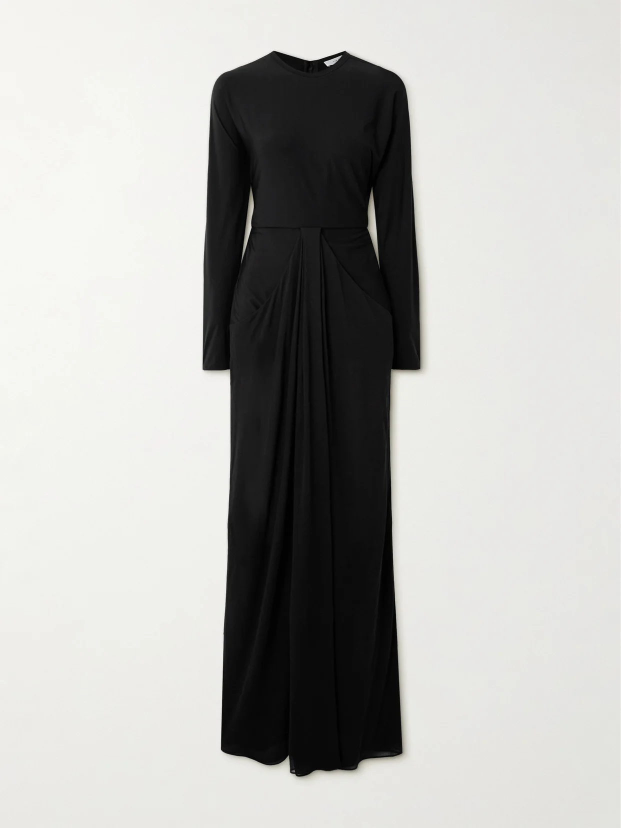 The Row's 'Anslem' dress is gathered and pleated at the front to enhance the drape of the silk-crepe trim. It's made from soft black jersey that skims elegantly over the figure. Complement the crew neckline with drop earrings.