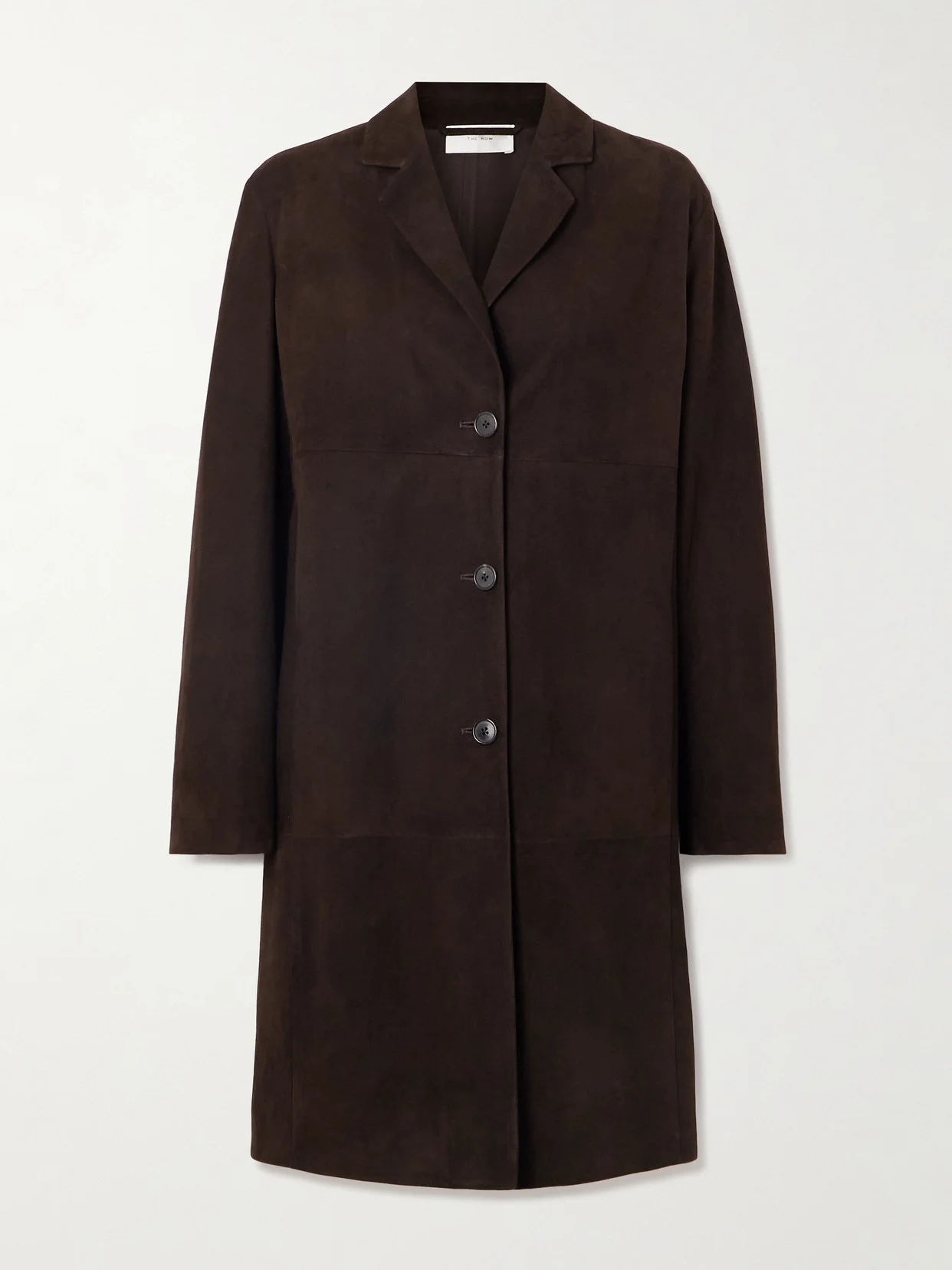 The Row's 'Babilonia' coat is made from panels of velvety-soft suede in a slightly loose fit. It's framed with a notched collar and fastens with horn buttons.