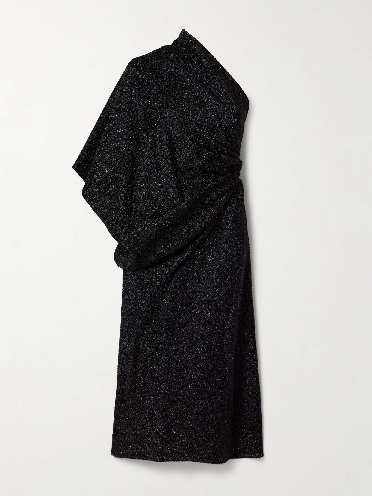 Dorota One-shoulder Draped Metallic Knitted Midi Dress