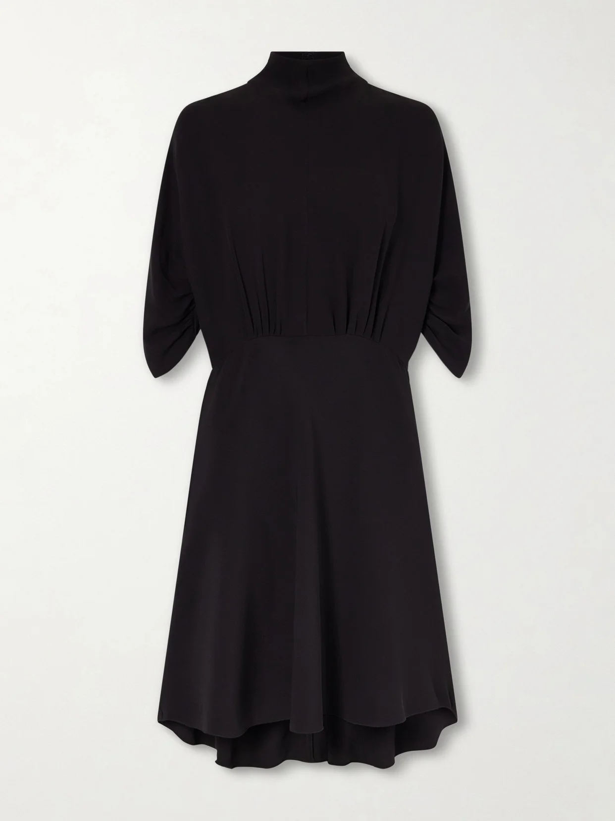 The Row's 'Emmeline' midi dress reflects the house's signature restraint. Cut from fluid silk to drape softly over the body, it has batwing sleeves and a loose bodice with gentle gathering at the waist. Take style cues from the Spring '26 lookbook and team yours with point-toe kitten heels.