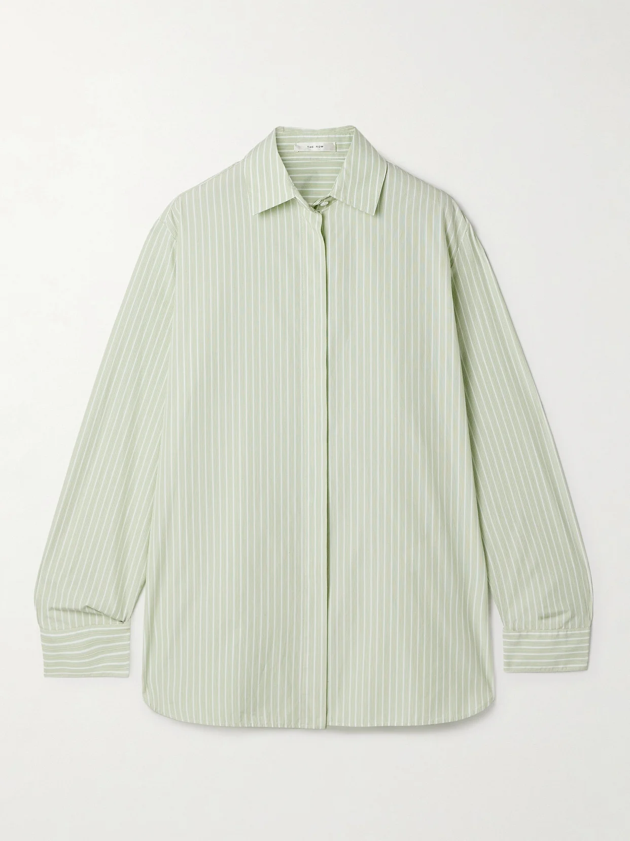 The Row's 'Vanda' shirt is cut from crisp cotton-poplin that's patterned with colorful stripes. Designed for a relaxed fit, it has slightly dropped shoulders and a long curved hem. Style yours with the coordinating shorts, leaving it undone to reveal a tank underneath.