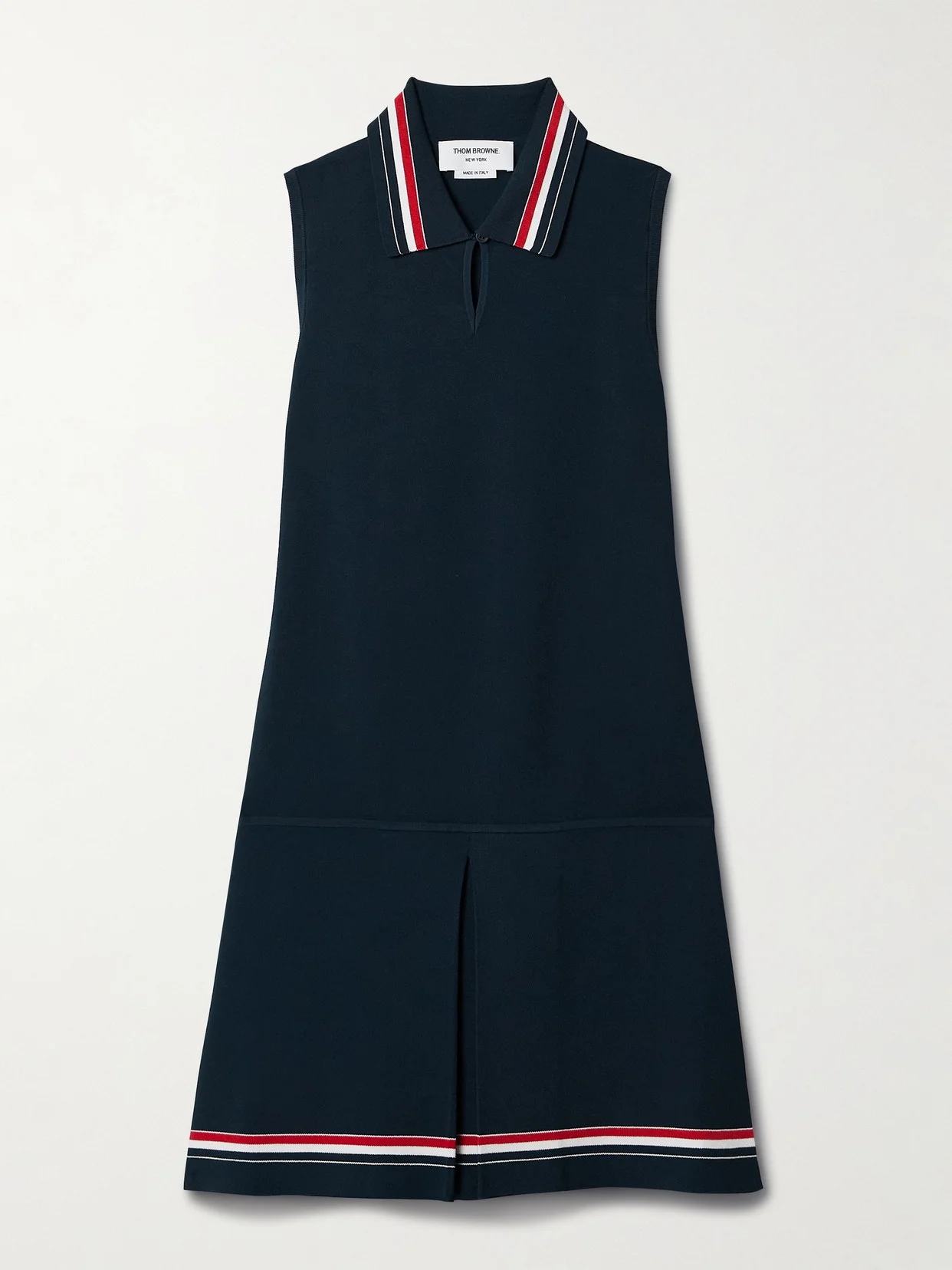 Thom Browne's dress is modeled after tennis styles, and looks equally chic on or off the court. It's made from navy stretch-knit that's traced with red and white stripes along the polo collar and mini hem. The inverted front pleat creates nice movement.