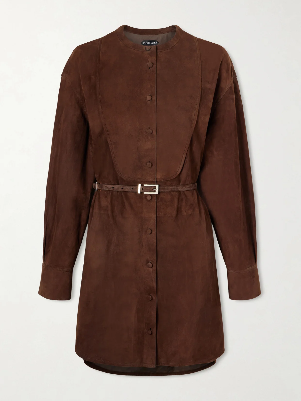 TOM FORD's belted mini dress is rich in color and texture. It's been crafted in Italy from 'Warm Chocolate' suede and has a bib front that mimics tuxedo shirts. Take styling notes from the label and undo a few buttons to create a keyhole neckline.