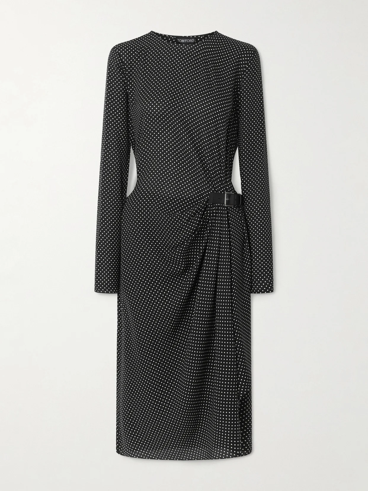 TOM FORD's dress is defined by the buckled leather tab that gathers the silk-twill fabric, which accentuates your waist and adds an unexpected edge. Thanks to the timeless polka-dot pattern, you'll be wearing it for many years to come.