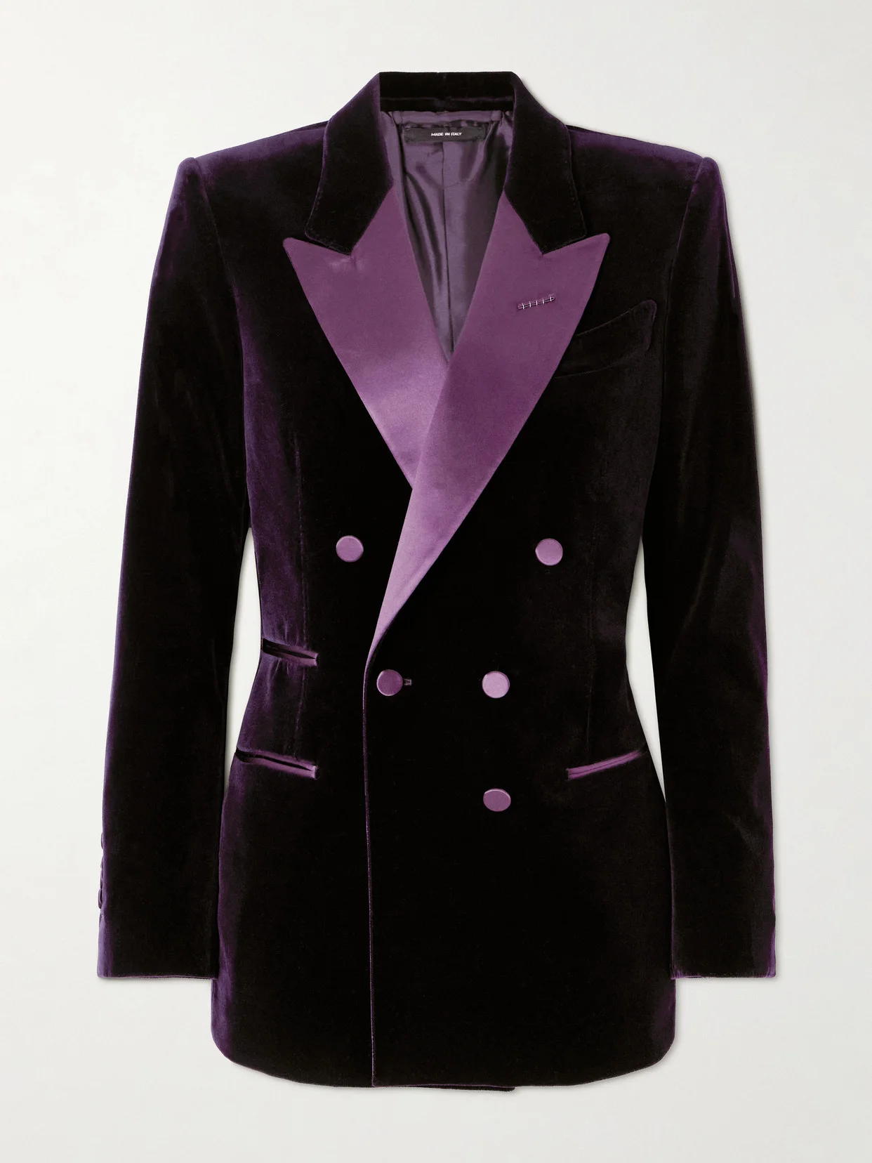 Traditional tuxedo jackets inspire TOM FORD's blazer. Made from plush cotton-blend velvet, it has a double-breasted front with satin peak lapels to match the covered buttons and jet pockets. Wear yours as a suit with the matching pants in our edit. Large to size. See Size & Fit notes.