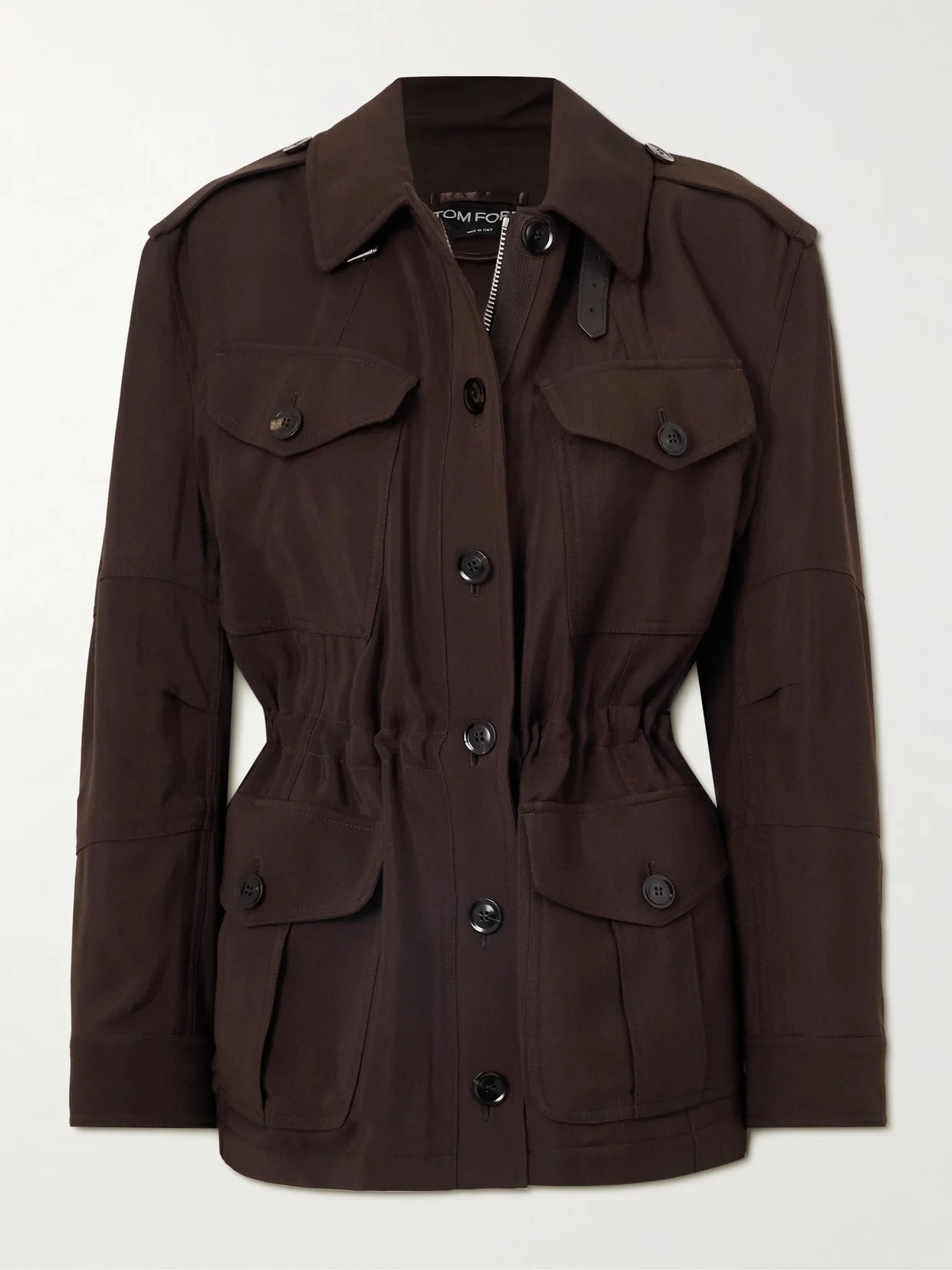 TOM FORD's jacket is a refined take on utilitarian styles. Made from rich brown twill, it has a leather throat latch and shoulder epaulettes. Use the drawcords at the waist to cinch and define the relaxed shape, and stow small essentials in the sizable cargo pockets.