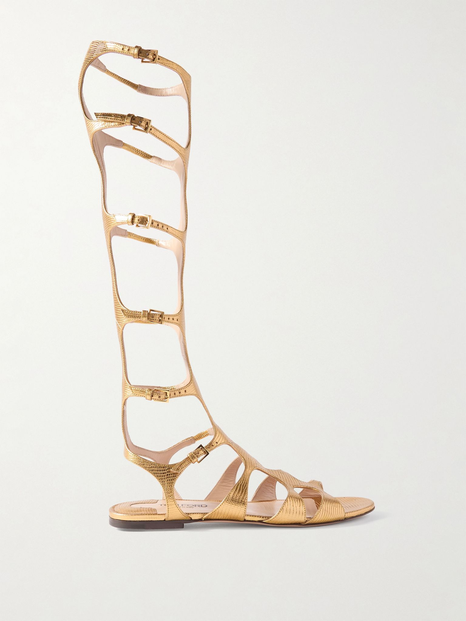 TOM FORD's 'Paradise' sandals have a gladiator-inspired design with slim straps and a knee-high profile that calls for higher hemlines. They've been made in Italy from lizard-effect leather and have plenty of buckles to create the perfect fit. Size & Fit - Fits true to size, take your normal size - Italian sizing Details & Care - Slight heel - Gold lizard-effect leather (Calf, Sheep) - Buckle-fastening straps