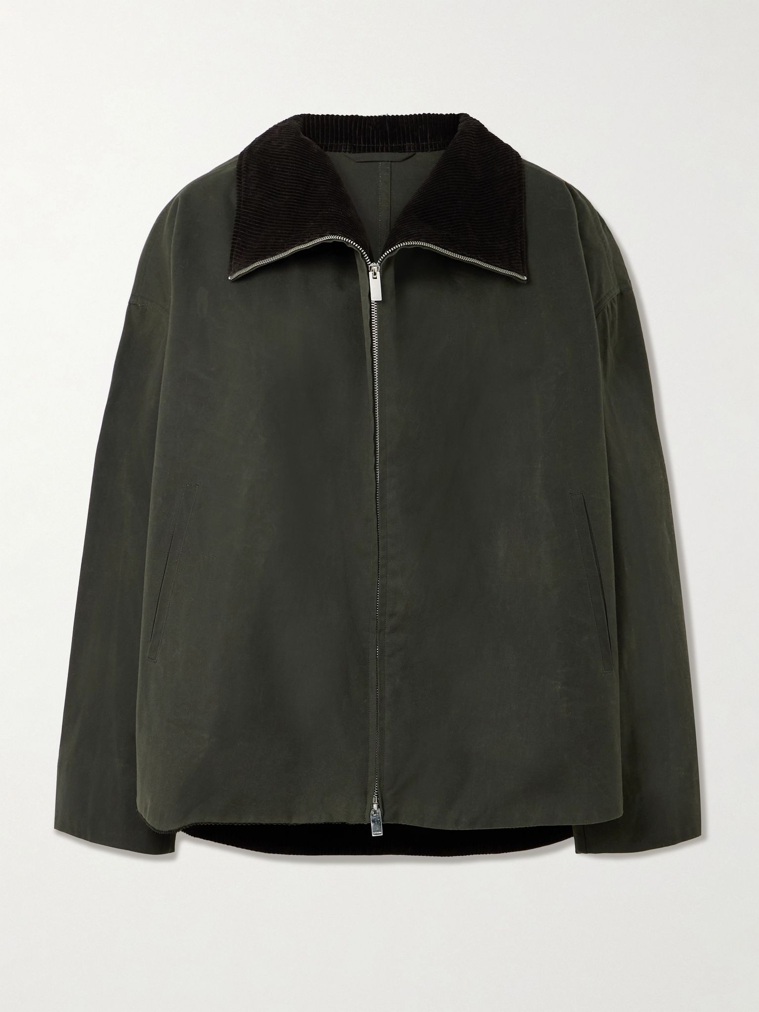 Corduroy-trimmed waxed organic cotton jacket Forest green