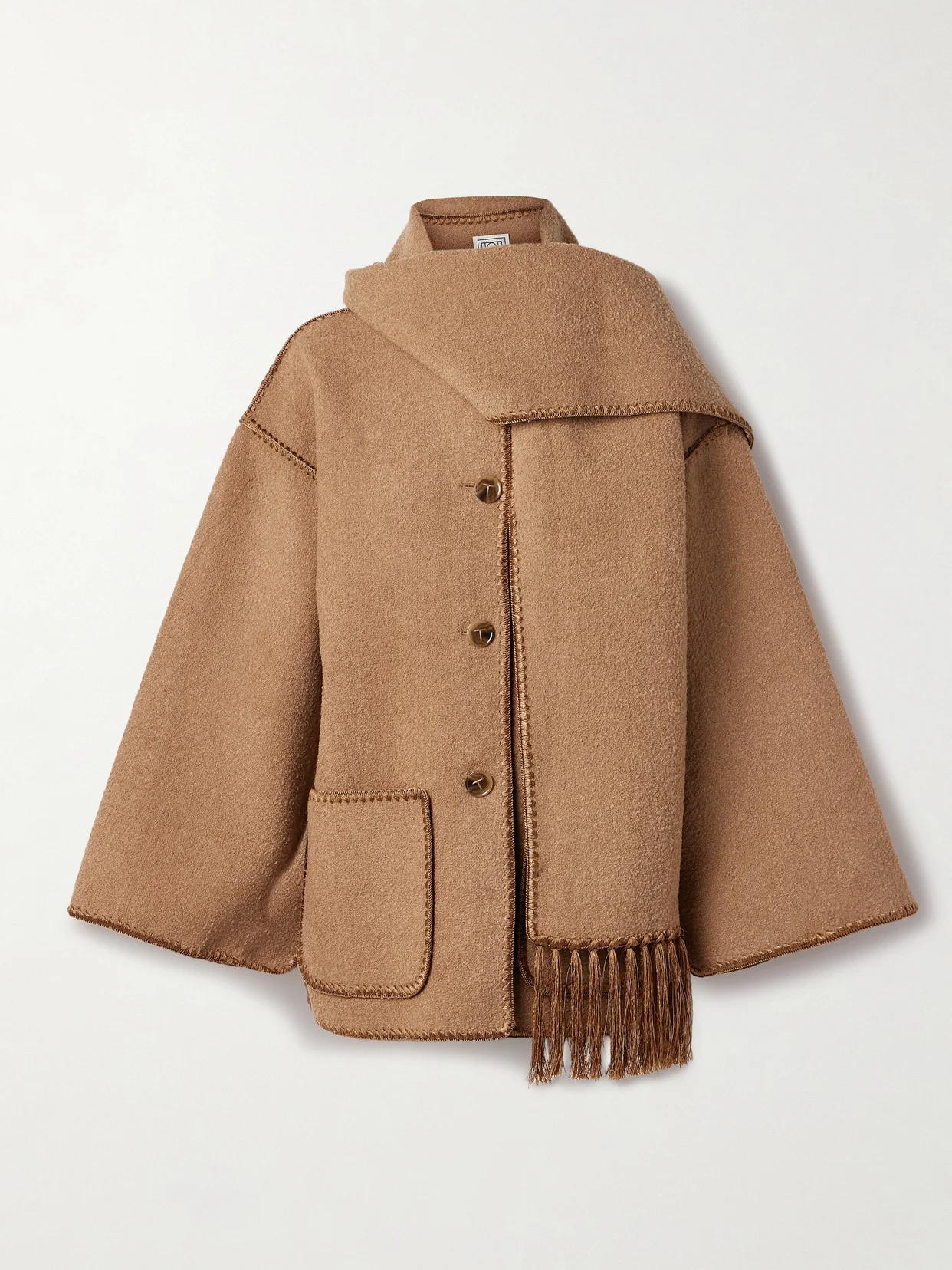 TOTEME's jacket combines two outerwear essentials with scarf-inspired panels that drape elegantly around your neck. Cut from camel wool-blend boucle, it's outlined by tonal chain stitches and frothy fringe. Button yours up over denim.