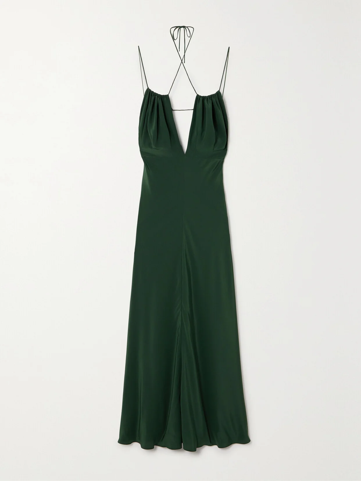 The deep emerald shade of TOTEME's maxi dress calls for a mix of sculptural gold and silver jewelry. It's made from fluid silk-satin that skims the body and has a plunging neckline framed by slim crossover ties.