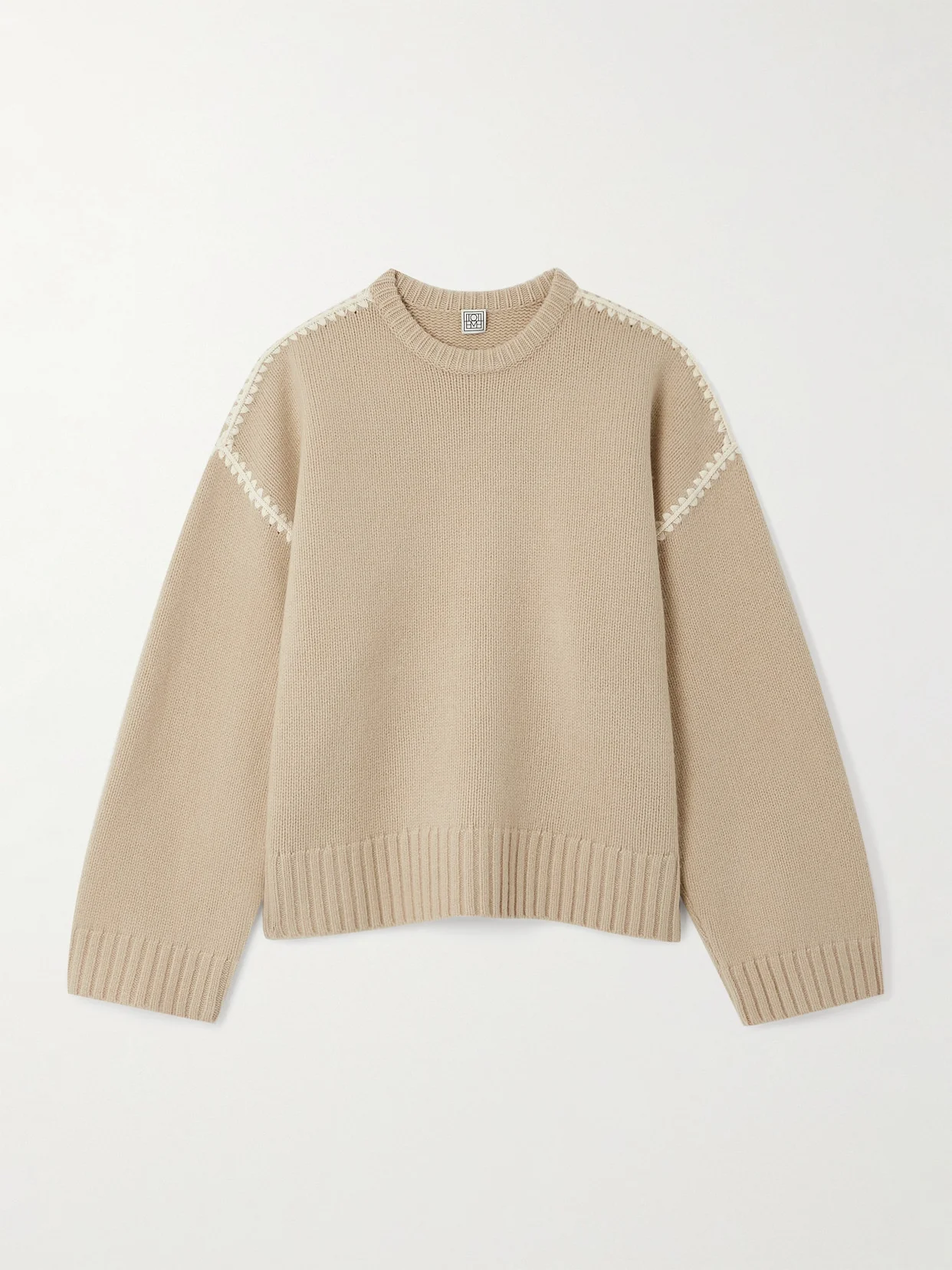 TOTEME's pared-back staples are designed to form part of a curated wardrobe that you can build on over time. Made from luxurious wool and cashmere-blend, this sweater is knitted for an oversized fit with dropped shoulders outlined by contrasting cream embroidery. Lower-Impact Materials. This product is made using at least 50% lower-impact materials or ingredients. Find out more about our NET SUSTAIN criteria here.