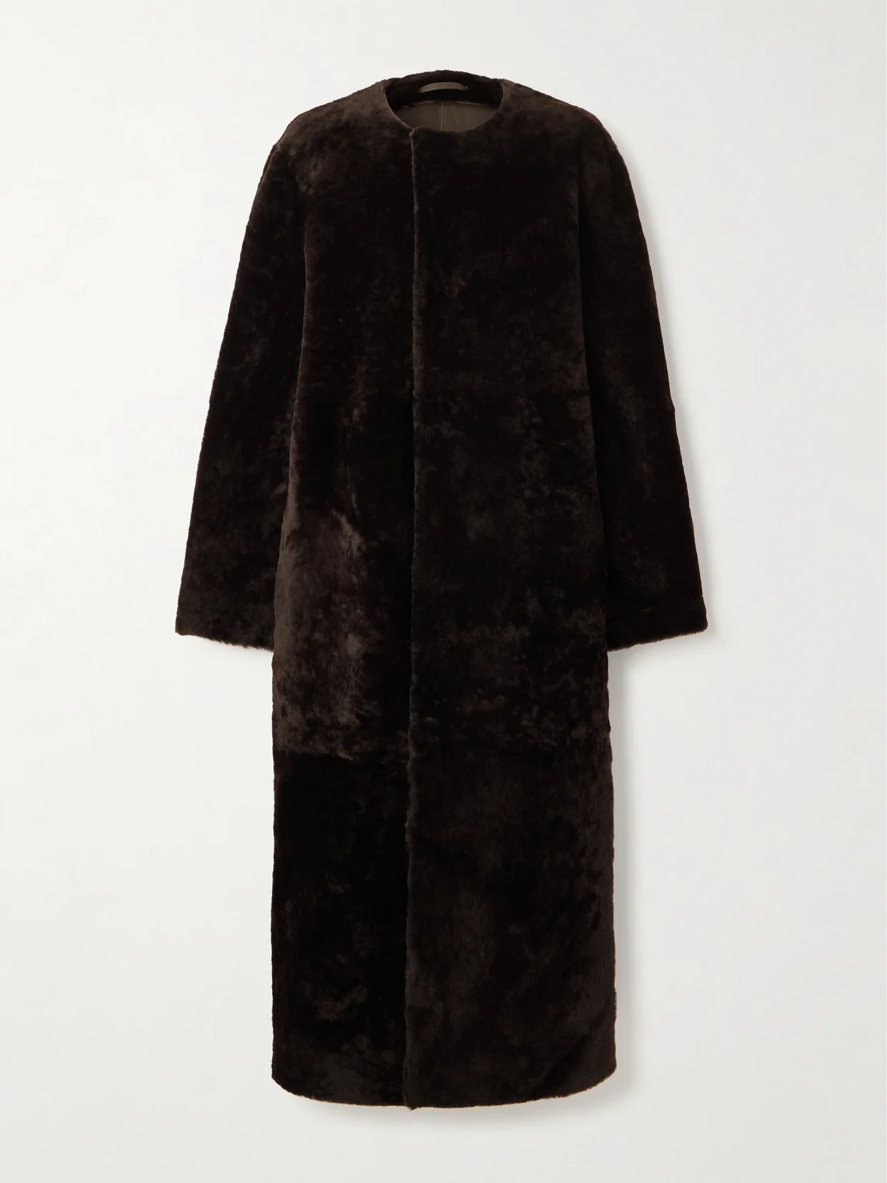 TOTEME's Fall '24 collection was filled with shearling coats like this one that are equally chic and endlessly cozy. It comes in a rich 'Bark' color and has a collarless, longline silhouette and streamlined front. Wear it over everything from dresses to tailoring.