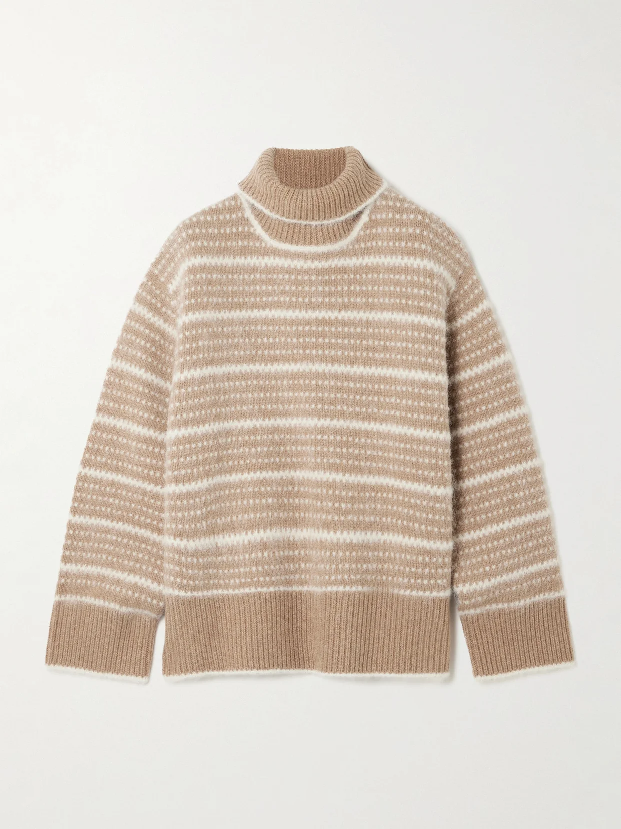 TOTEME's turtleneck sweater takes its name from the Fair Isle-inspired striped pattern. It's knitted in a relaxed shape from an insulating wool-blend with a good dose of alpaca for softness. Wear yours as part of a tonal outfit. Lower-Impact Materials. This product is made using at least 50% lower-impact materials or ingredients. Find out more about our NET SUSTAIN criteria here.