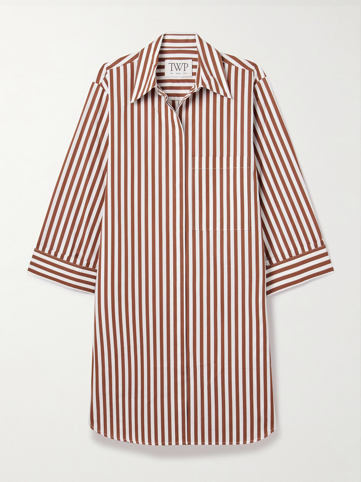 TWP's dress is playfully named the 'Morning After'. Modelled after men's shirting, it's cut for a loose fit from striped cotton-poplin and has a sharp point collar and curved hem that's slightly longer in the back.