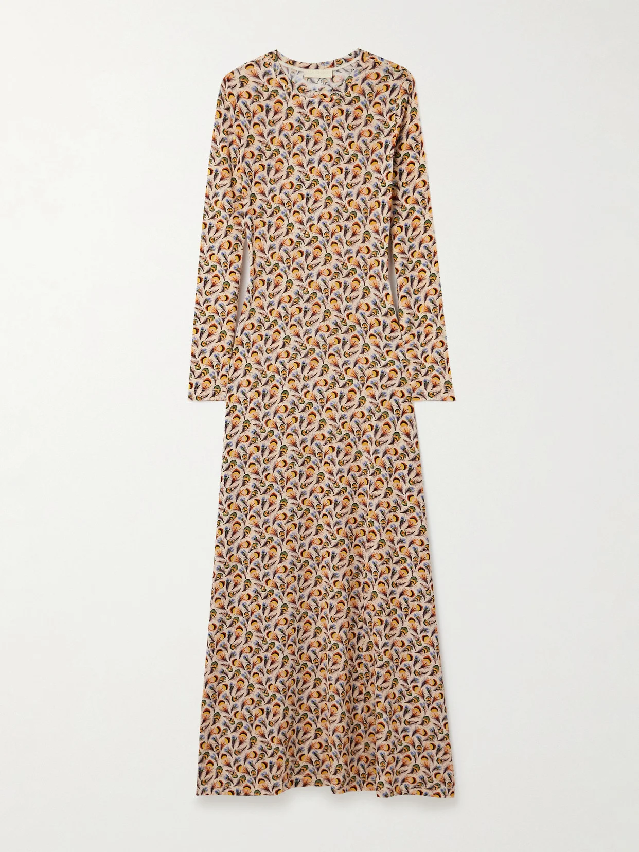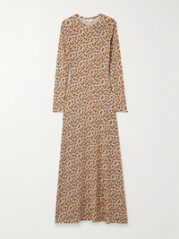 Ulla Johnson's 'Amari' dress is decorated with a colorful 'Swan' feather motif, which can be seen throughout the brand's Fall '25 collection. Cut from smooth stretch-jersey, it has a slim bodice and a flowy maxi skirt.