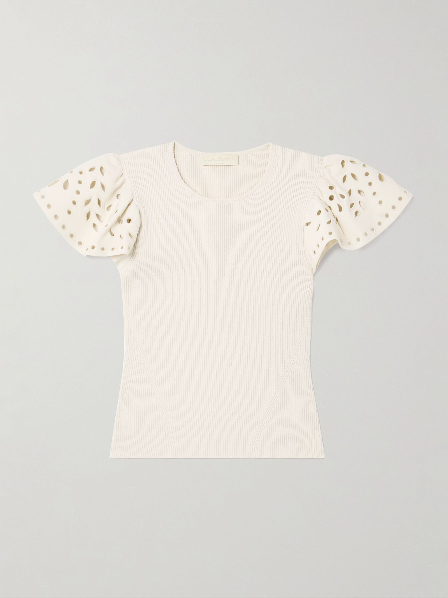 Ulla Johnson's 'Edith' top is rib-knitted for a slim fit and framed by embroidered ruffled cap sleeves. Keep it pared-back with jeans or add a floaty skirt. Size & Fit - Fits true to size, take your normal size - Designed for a slim fit - Mid-weight knit - Model is 180cm/ 5'11" and is wearing a size Small Model measurements: - Bust: 80cm/ 31.5" - Waist: 65cm/ 25.5" - Hip: 89cm/ 35" Details & Care - Beige ribbed-knit - Slips on - 83% viscose, 17% polyester - Designer color: Cowrie