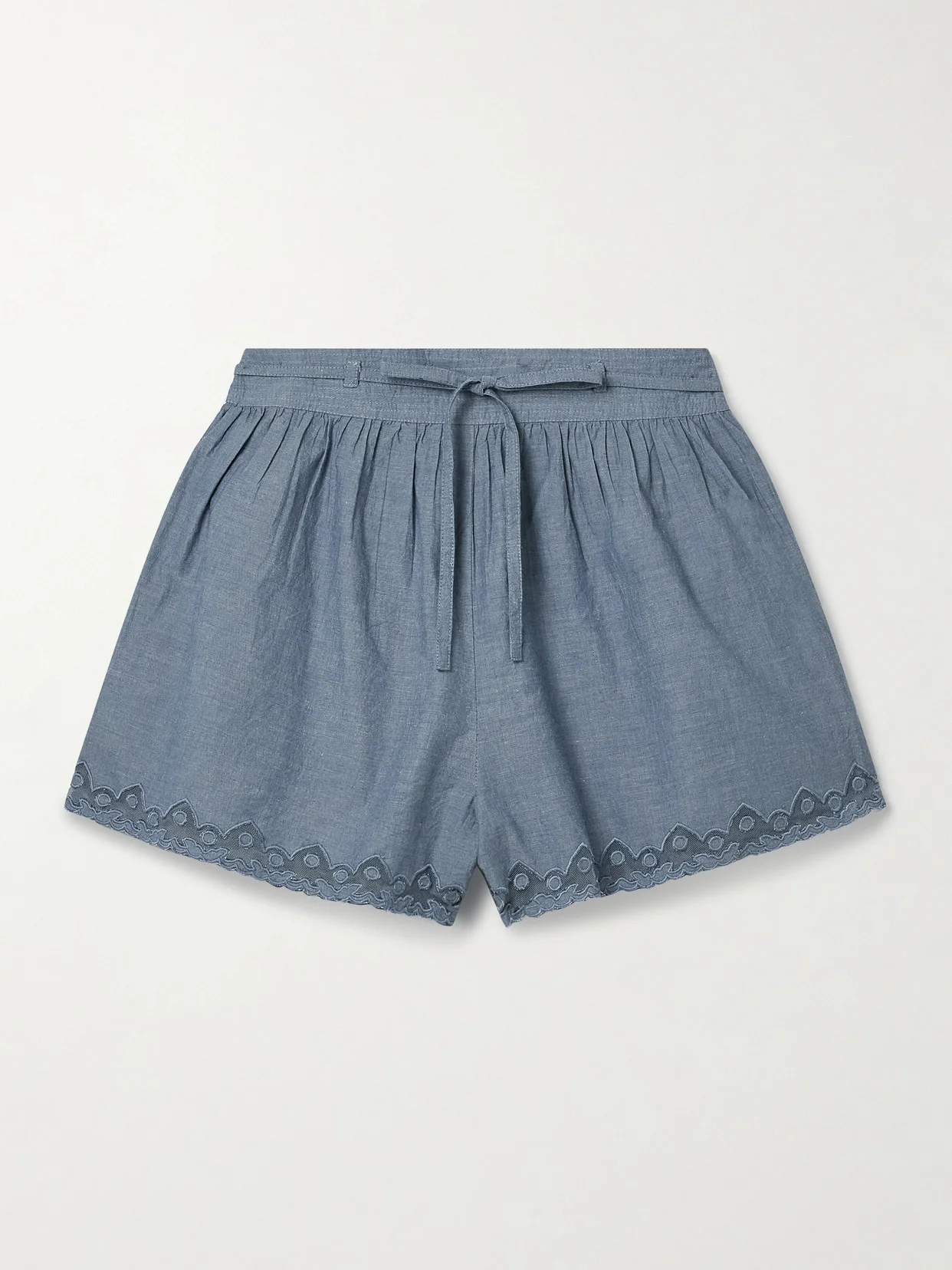 Elowen Belted Tulle-trimmed Embroidered Cotton-chambray Shorts