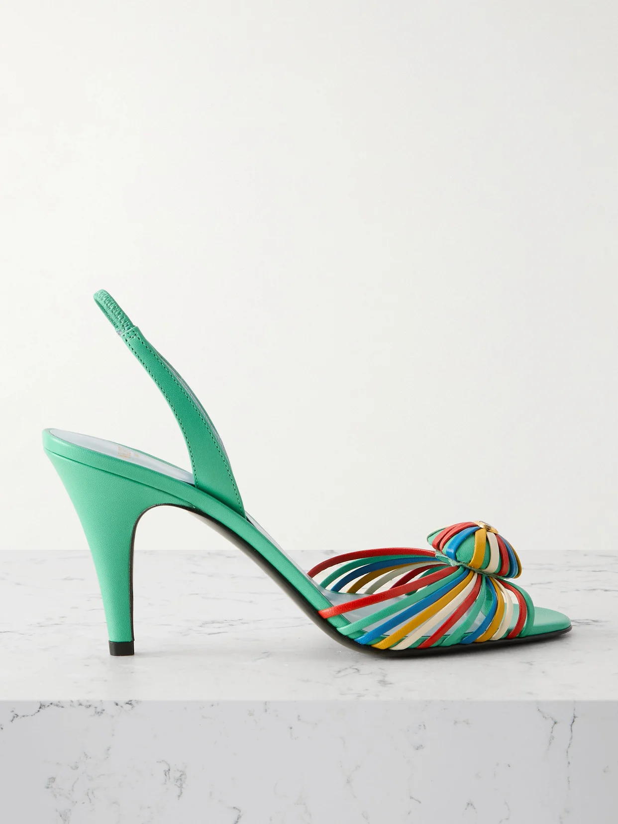 Valentino Garavani's sandals have a glamorous retro-inspired feel. They're made from strips of colorful leather and have a caged silhouette centered with a 'VLogo' embellished heart. The elasticated slingback strap and 85mm heels keep them comfy.