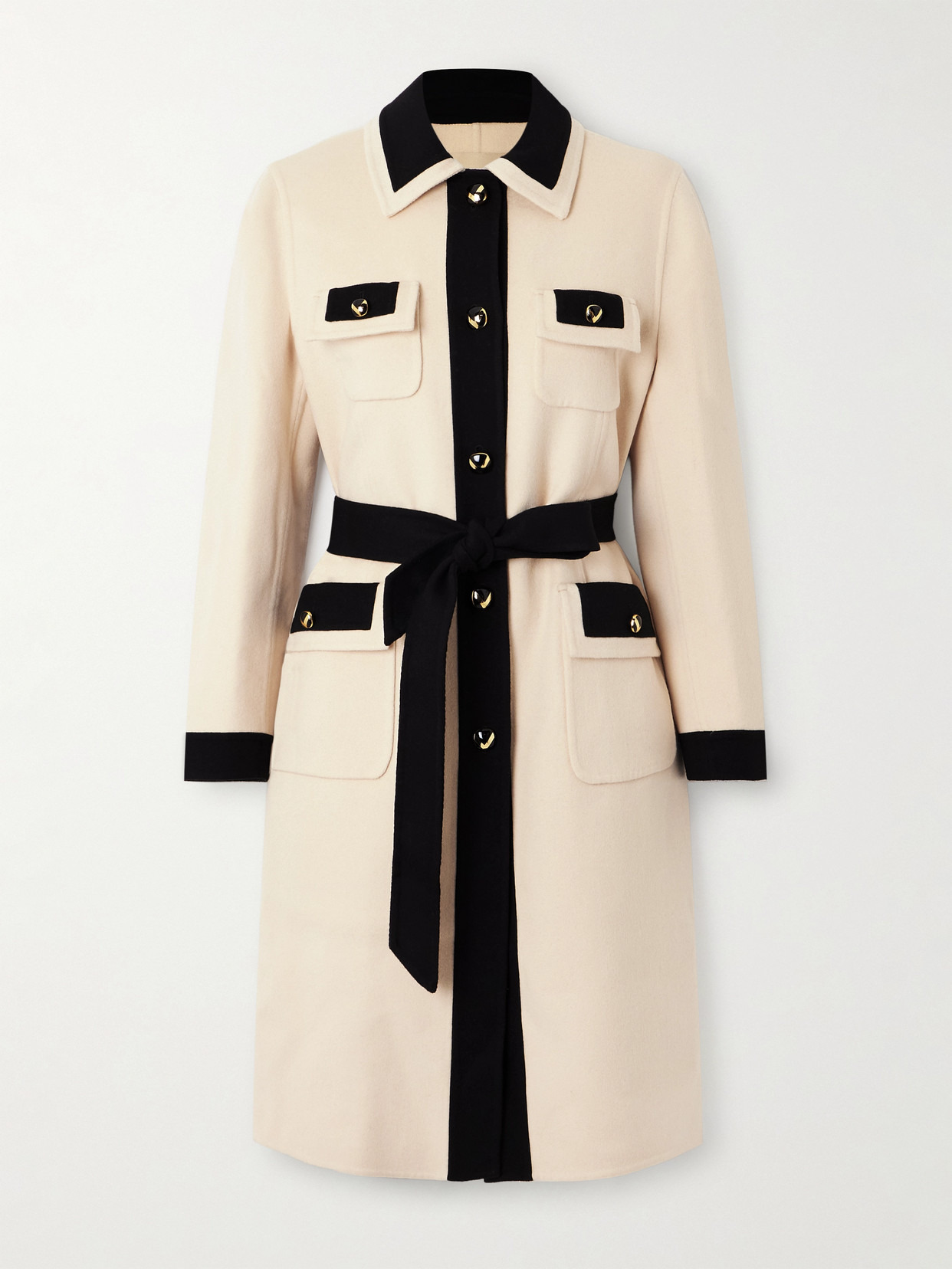 There's a vintage charm to Valentino Garavani's coat. Made from brushed wool and cashmere-blend, it's accented with gleaming gold-tone buttons and bordered with black at the edges. It works with the belt cinching the waist or without for a straighter profile.