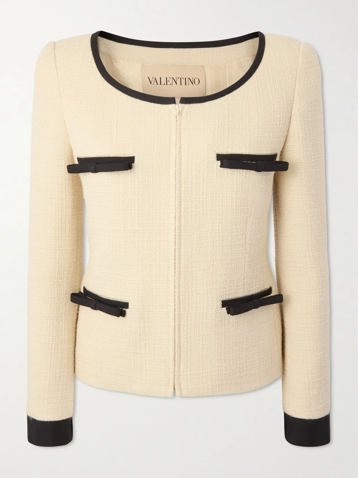 Valentino Garavani's jacket pays tribute to classic style, revised for today. It's expertly tailored from wool-blend tweed that has a structural quality so it holds the subtle hourglass shape over time. Defined by a wide neckline, it's traced with contrast trims, including dainty crepe courene bows.