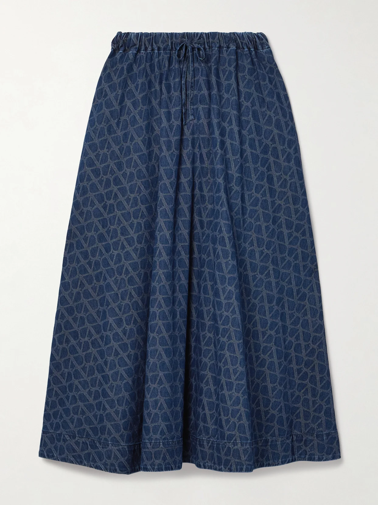 Valentino Garavani's denim midi skirt is jacquard-woven with a repeating 'VLOGO' motif that creates a cool, abstract pattern from afar. The waistband is threaded with an adjustable drawstring, while discreet pockets add to its casual feel.