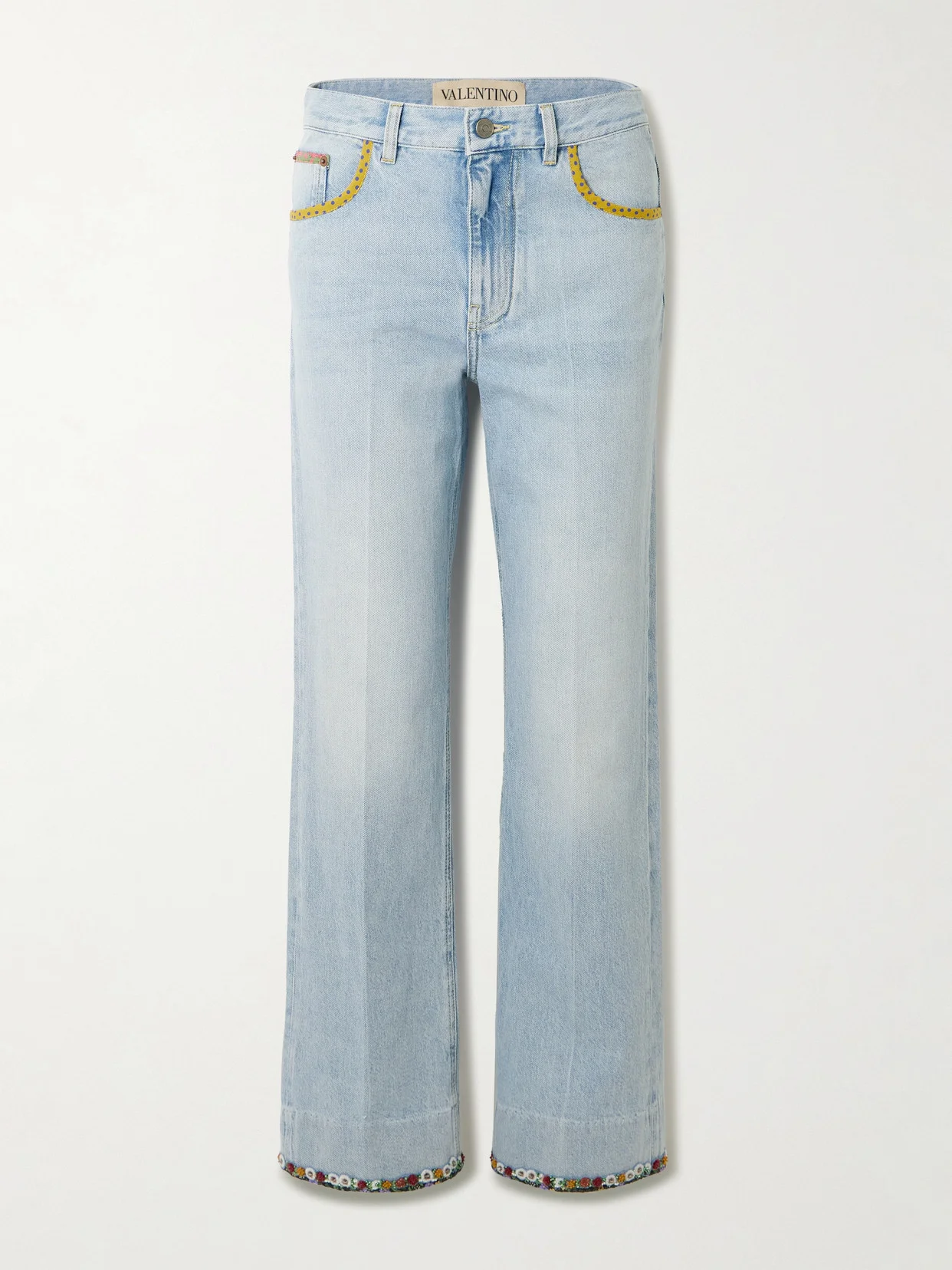 Valentino Garavani's playful and experimental take on jeans is so fun to wear. This pair has straight legs and cuffs that are traced with pretty beadwork. The front pockets are outlined with vibrant polka-dots, while the back ones are trimmed with floral fabric.