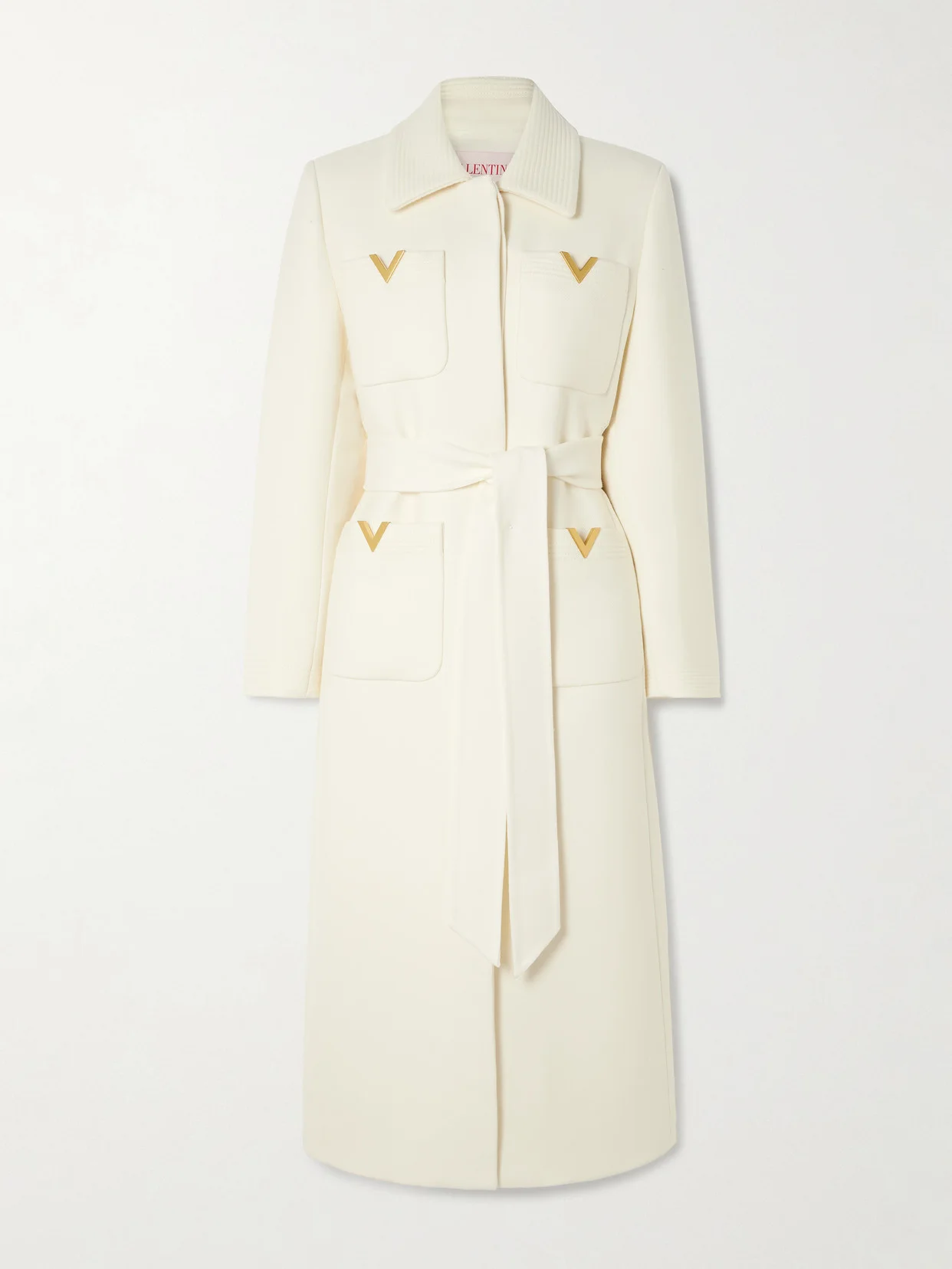 The pockets of Valentino Garavani's glamorous coat are tipped with the house's signature 'V' hardware. It's tailored from luxe wool and silk-blend twill that's ribbed at the pointed collar and has a streamlined covered placket and self-tie belt to draw in the waist.