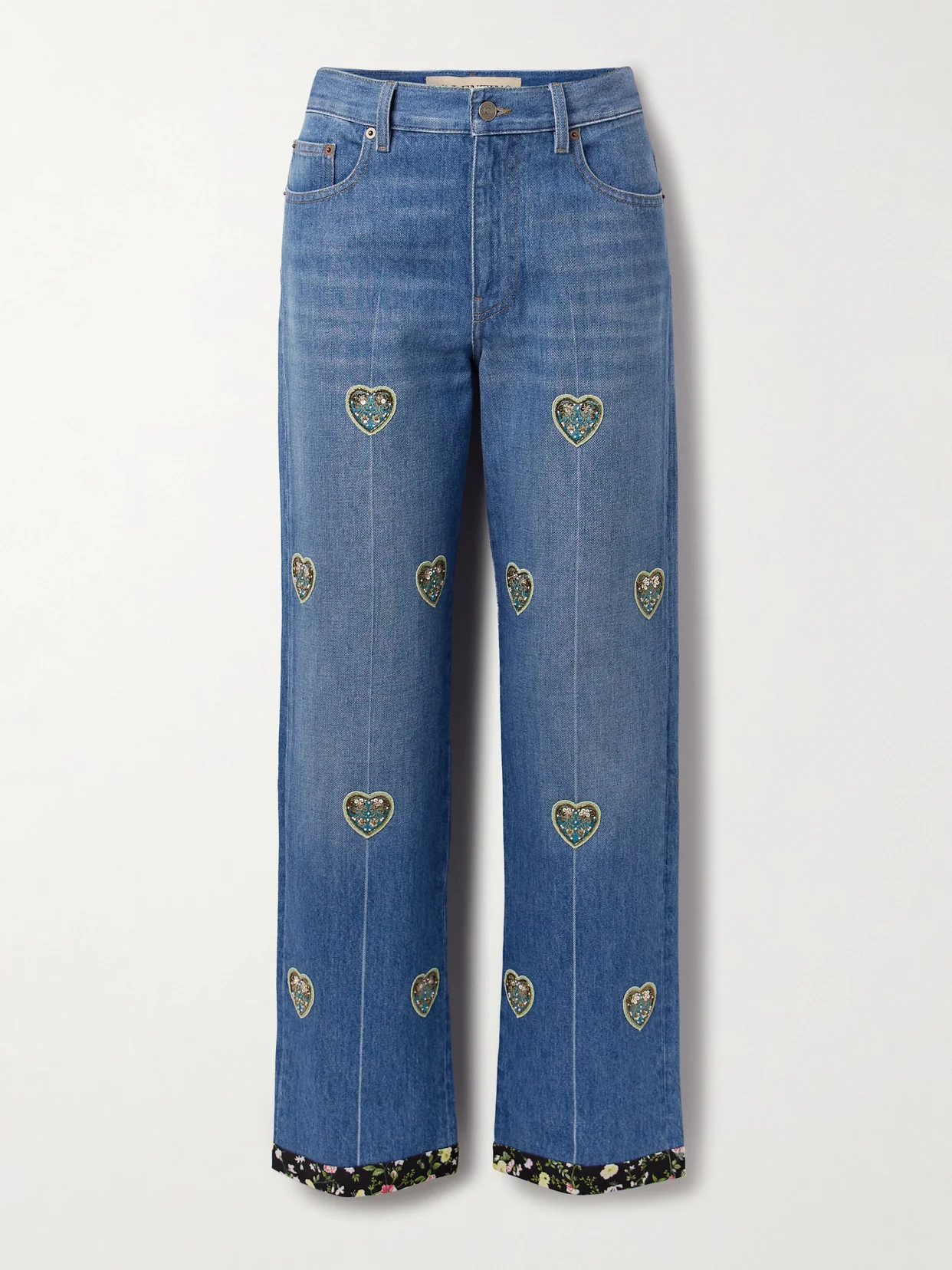 Valentino Garavani's straight-leg jeans are appliqued with hearts that are embroidered and embellished to create floral motifs within. Cut to sit high on the waist, they have printed crepe de chine trims along the hems. Wear yours with an equally playful sweater or graphic T-shirt.