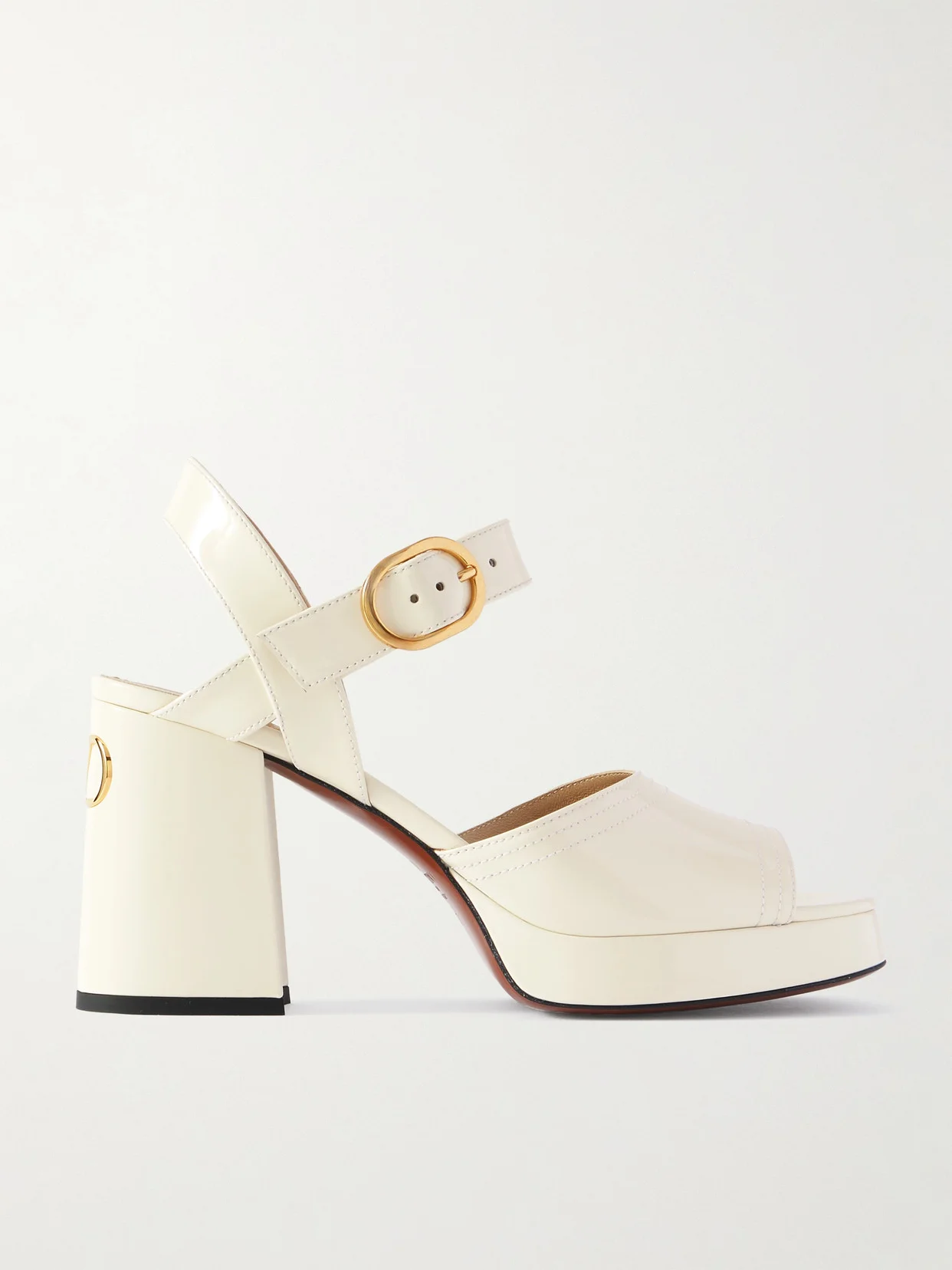 Valentino Garavani's 'Fawcette' sandals are reminiscent of chic retro styles. Made in Italy from glossy patent-leather, they have rounded open toes and block heels embellished with gold-tone 'VLogo' hardware. Wear yours with mini skirts and wide-leg pants.