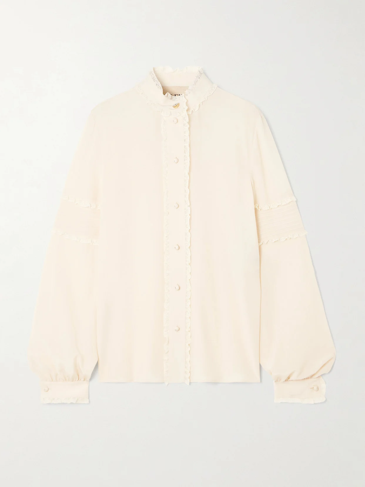 Valentino Garavani's signature romanticism shines through in this delicate blouse. Cut from fluid silk crepe de chine, it features delicate ruffled lace trims, a high neckline and lustrous buttons that lend a refined, vintage-inspired finish. Tuck yours into tailored pants or a sleek midi skirt.