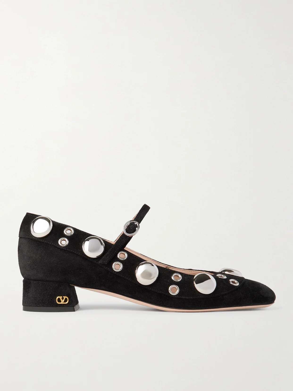 Valentino Garavani elevates Mary Janes by adding chunky round studs and eyelets to these 'Nellcote' pumps. Made in Italy from smooth suede, they have comfortable block heels embellished with a gold-tone version of the label's 'VLogo.'