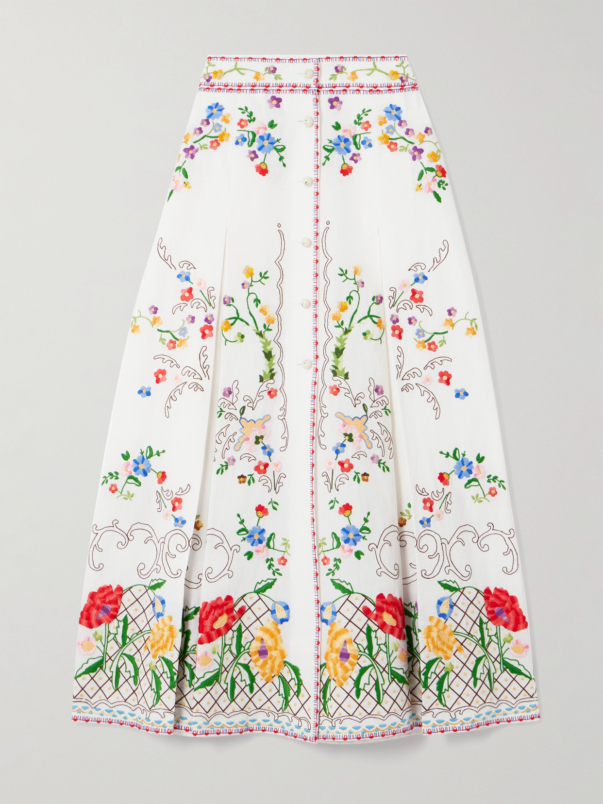 Valentino Garavani's midi skirt is made from breathable cotton, linen and silk-blend that's embroidered with colorful flowers and swirling motifs. It sits high on the waist and has inverted pleats that emphasize the floaty shape.