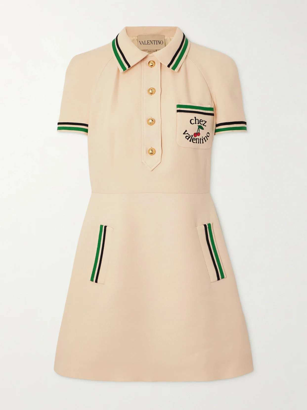 Valentino Garavani's dress has such a fresh, preppy feel. Made from wool and silk-blend, it has sporty stripes along the polo collar, cuffs and pockets and is printed with the label's 'Chez Valentino' and cherry graphic.