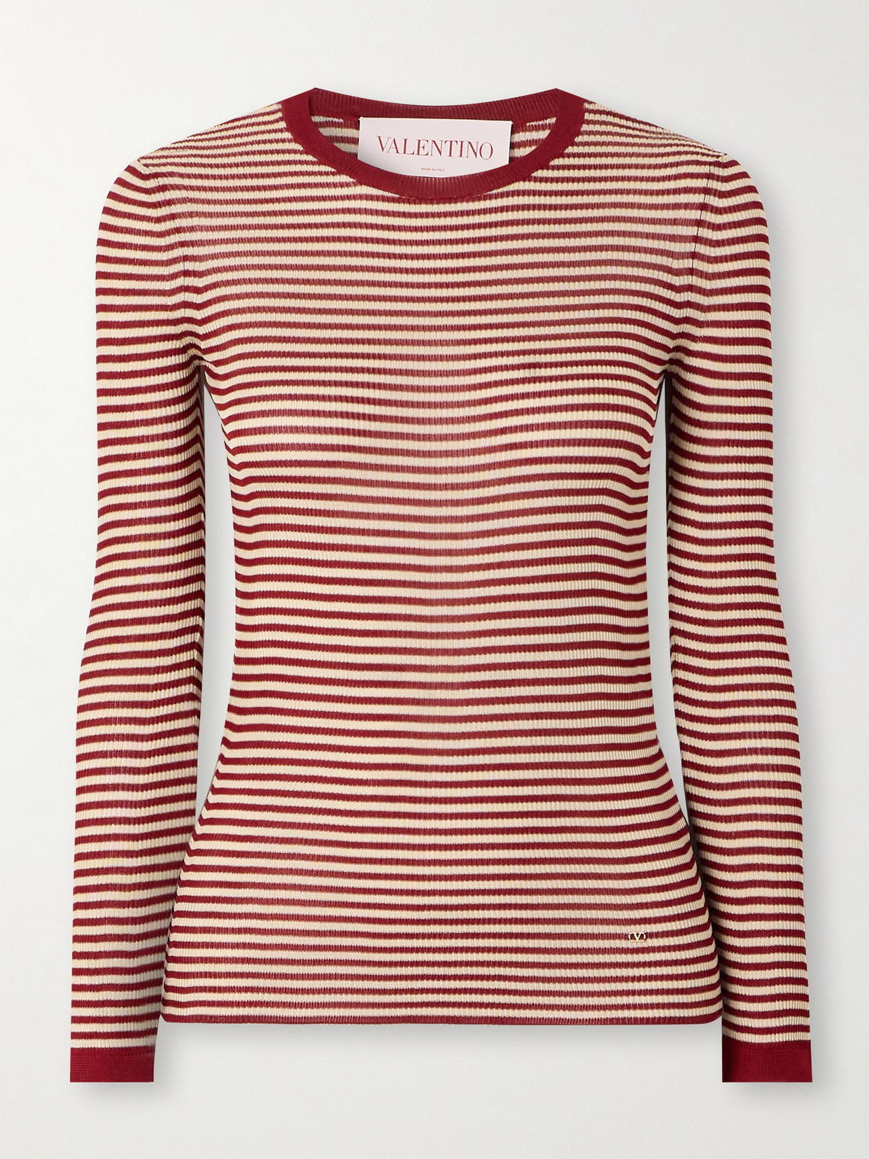 Valentino Garavani's sweater is knitted from silk in a red and cream striped pattern and has a textural ribbed finish. It's designed for a figure-hugging fit and complete with a petite version of the 'VLOGO' at the hip, so you may want to leave it untucked.